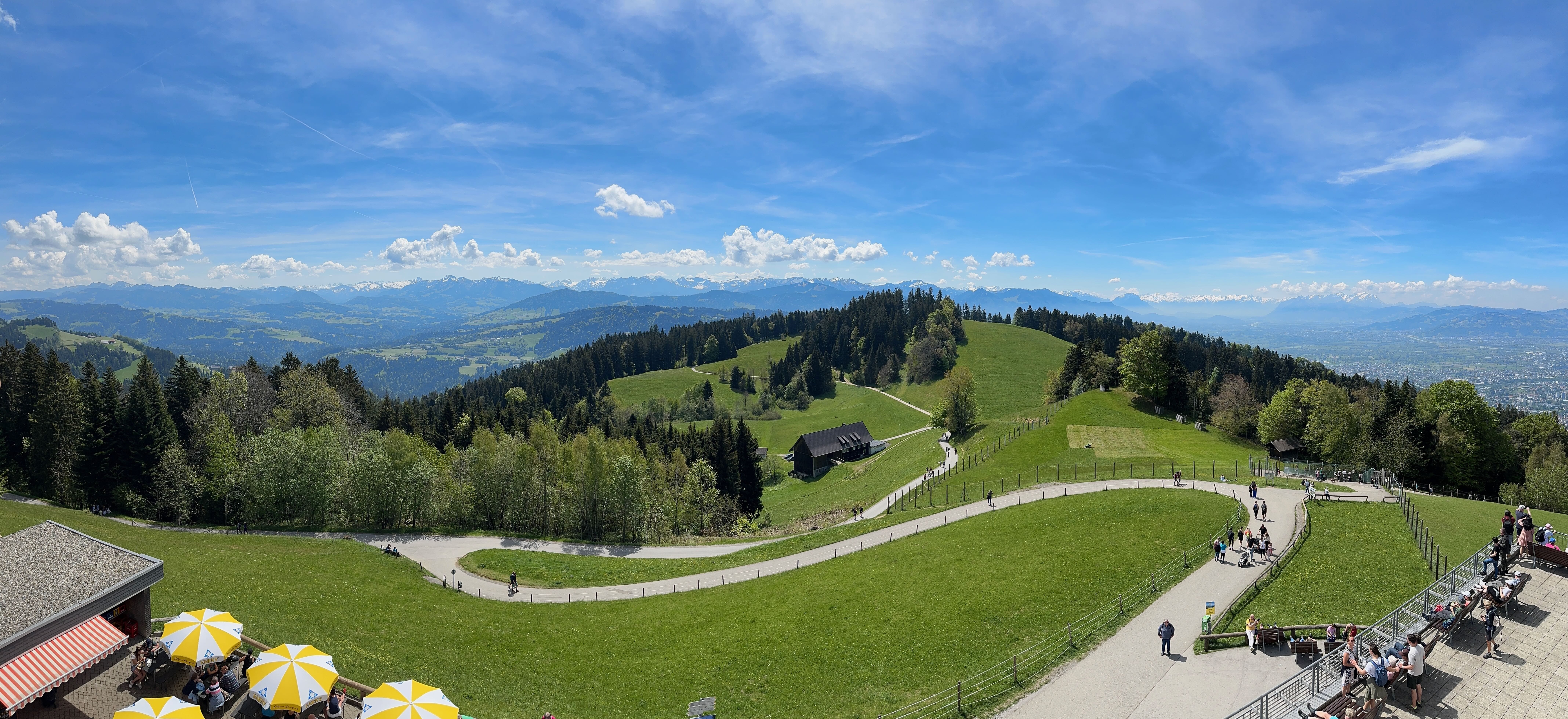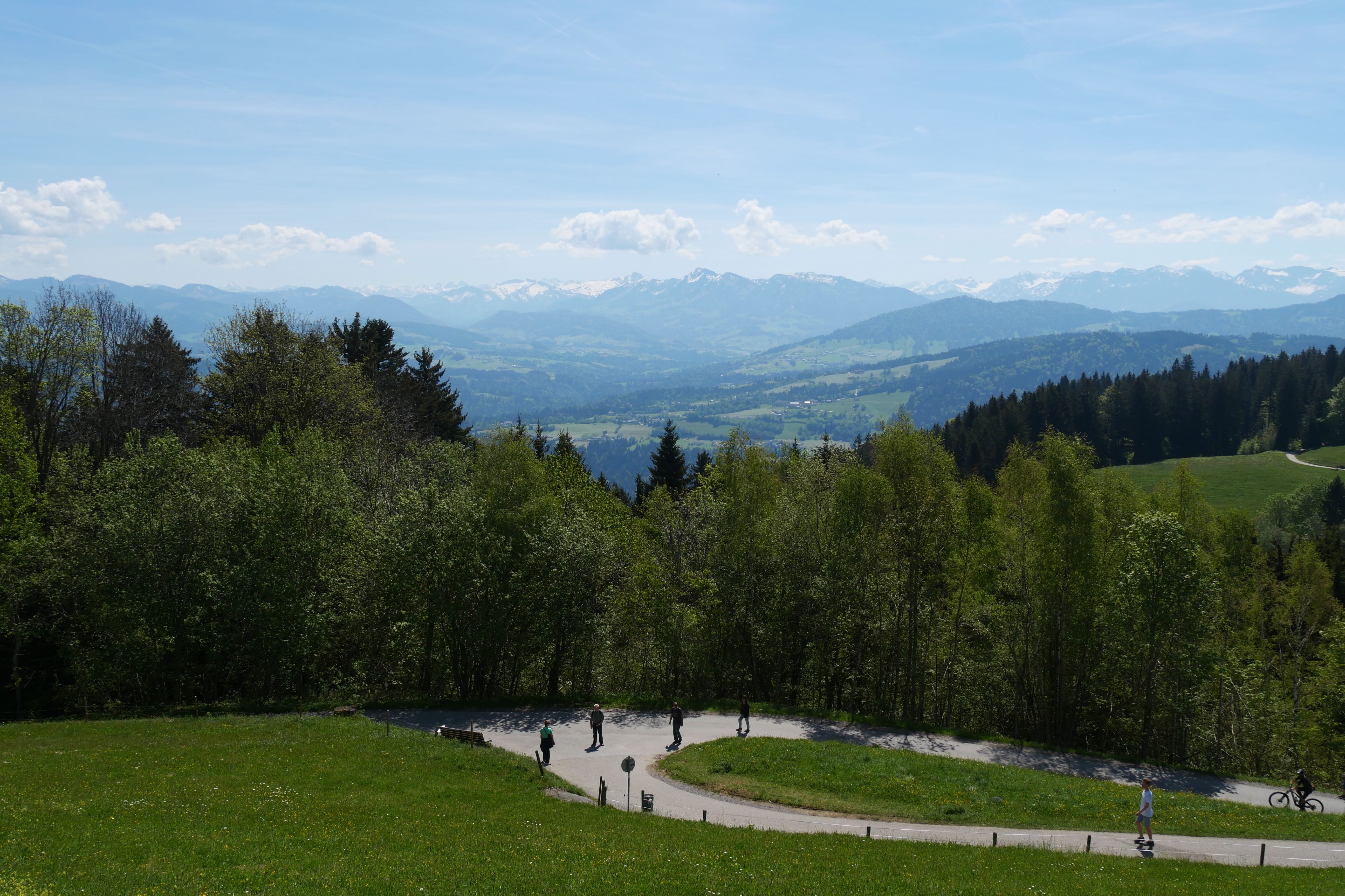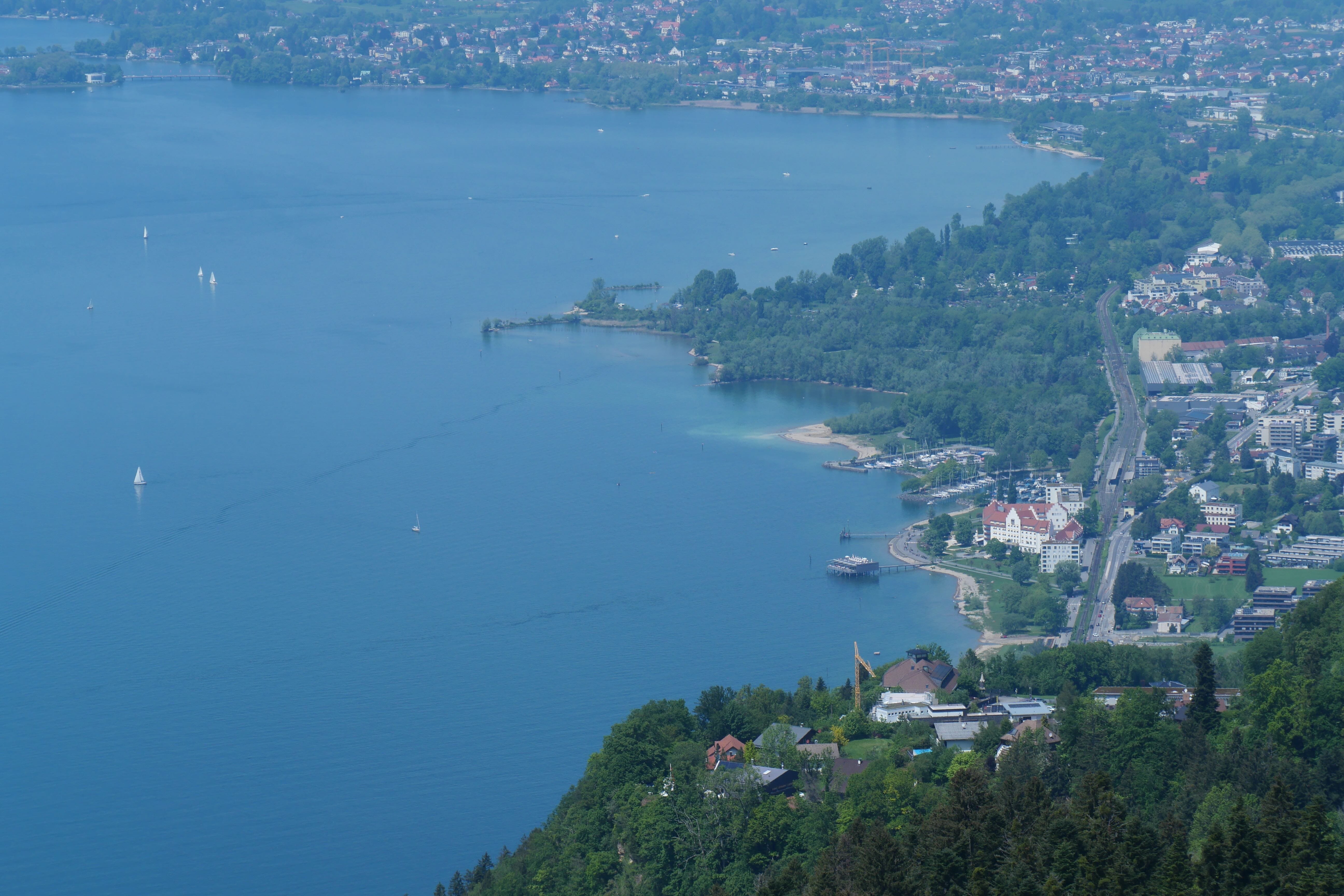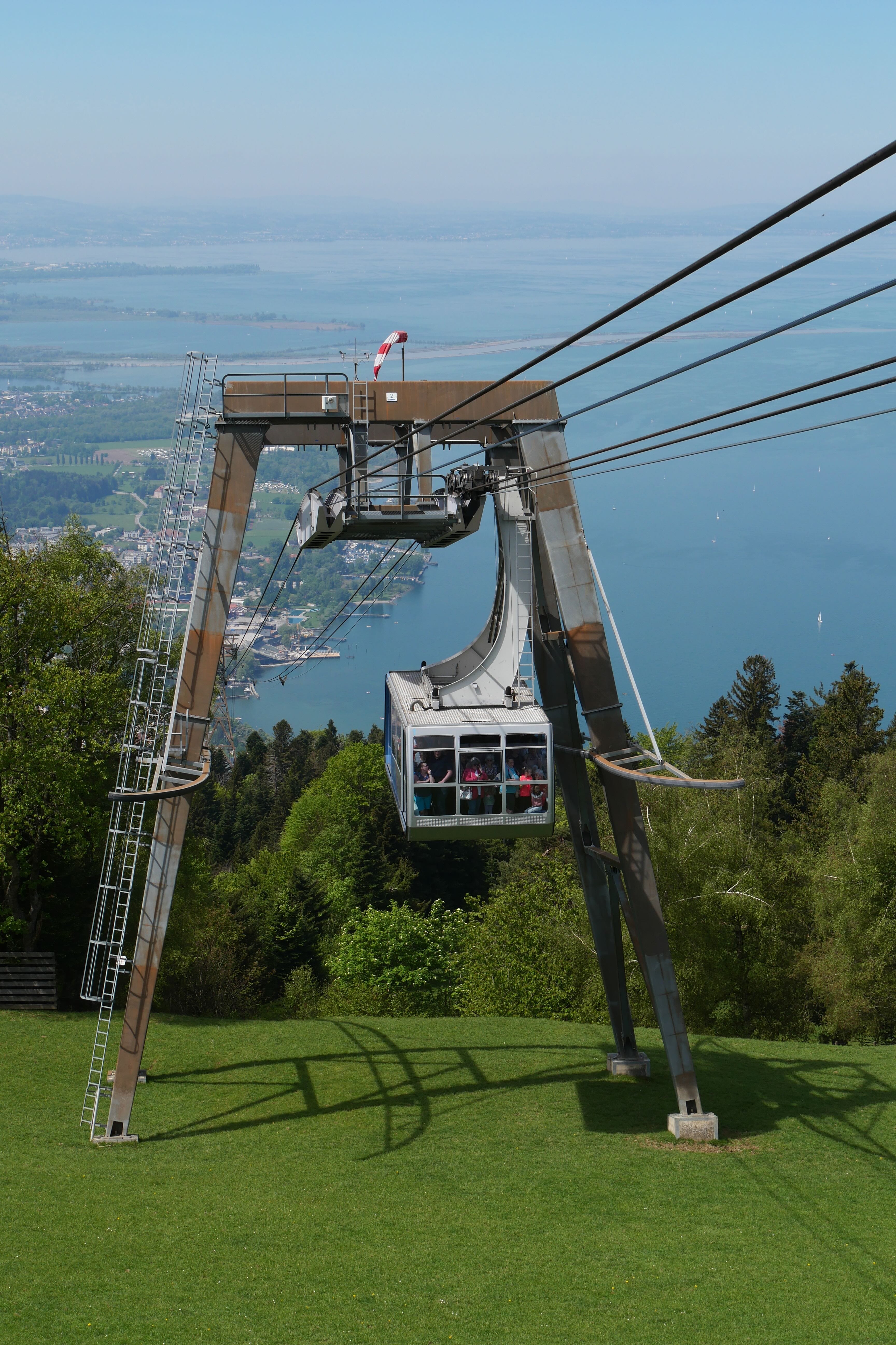 C’est donc à Bregenz, en Autriche, que nous faisons notre deuxième escale de la journée afin d’emprunter le téléphérique du Pfänder (également inclus dans la BCP) qui permet d’arriver en haut de la colline et d’avoir une vue plongeante sur le lac. Ne vous fiez pas forcément à la longue file d’attente au pied du téléphérique, elle diminue relativement vite, et n’hésitez pas à vérifier qu’il n’y a pas une file pour ceux ayant déjà un billet (si comme nous avez la BCP, vous êtes alors prioritaires et n’avez pas besoin d’attendre pour un ticket). En haut, la vue en vaut vraiment la peine et un petit parc animalier (gratuit) permet aux enfants, et aux plus grands, de découvrir quelques espèces qui vivent dans les montagnes. Il est possible de faire l’ascension ou la descente à pied. D’après ce que nous avons pu observer, pour de bons marcheurs, il faudra compter environ 1h-1h30 pour atteindre la gare du téléphérique et les différents points d’observation. Nous avons eu la chance d’avoir une très belle météo ce jour-là et de pouvoir prendre notre pique-nique au soleil face au lac.