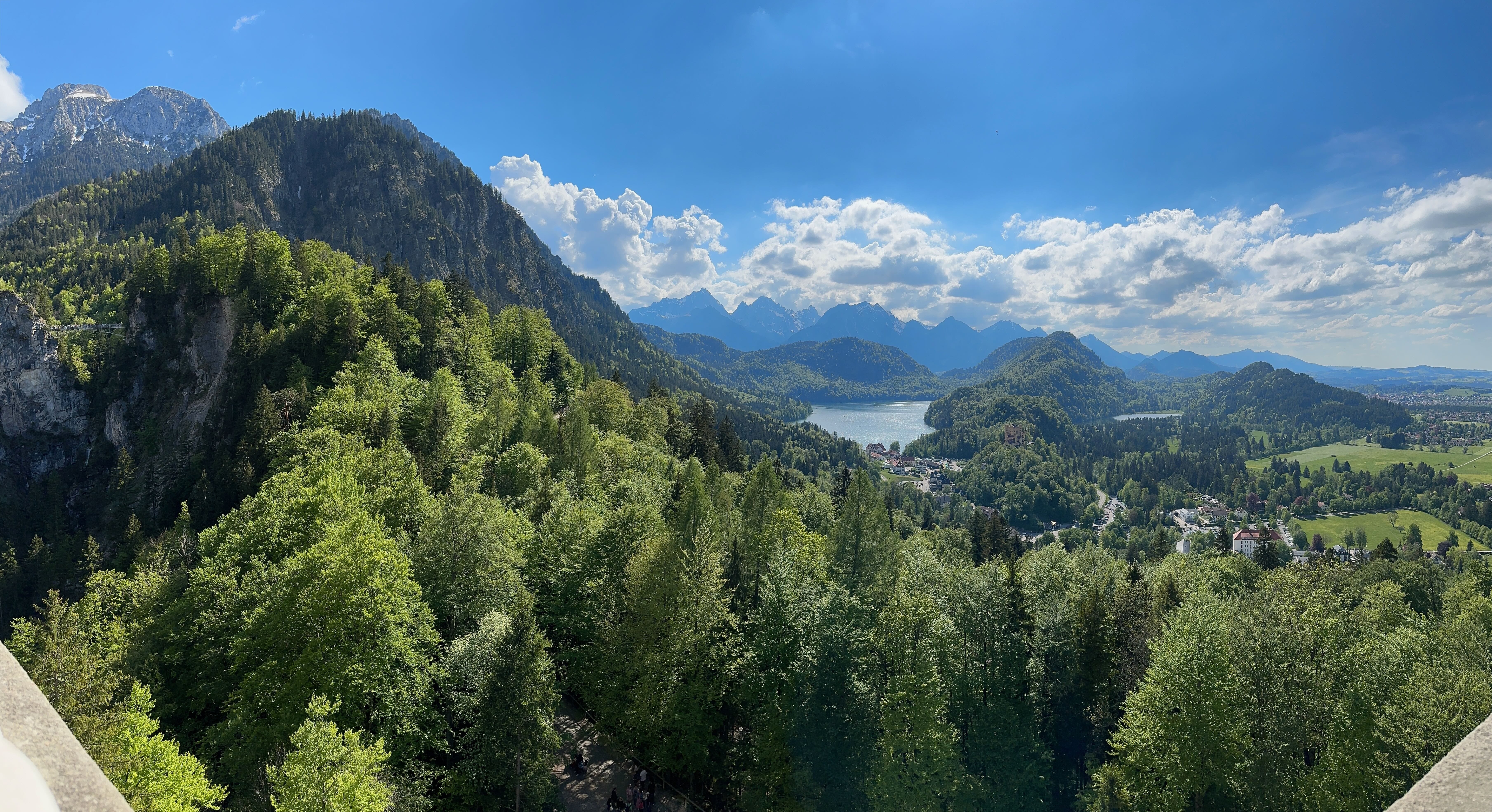 Concernant la visite en elle-même, il n’est possible d’entrer dans l’enceinte du château qu’avec un billet et uniquement 15 minutes avant l’heure de visite prévue. Ne voulant pas rater le moment d’entrer, nous n’avons pas osé nous balader sur la terrasse intérieure. Nous le regretterons ensuite car la sortie ne se fait pas au même endroit et nous ne pourrons jamais y retourner. Au final, on ne visite qu’un étage du château, celui où a vécu brièvement le roi Ludwig II. Les pièces sont richement décorées et présentent un confort assez moderne, le château ayant été construit à la fin du XIXe siècle. Il est interdit de prendre des photos et bien que nous ne pouvions pas le savoir avant, nous trouvons que le tarif, de 20,50€ par personne, est très élevé pour la petite demi-heure passée à l’intérieur. D’autant plus, si on y ajoute le tarif du parking et des transferts pour certains. Les plus beaux clichés et souvenirs que nous en aurons seront finalement ceux pris depuis le pont à quelques centaines de mètres car c’est de là que l’on peut avoir une vue globale du château au milieu de la forêt et avec une vue plongeante sur la vallée en contrebas.