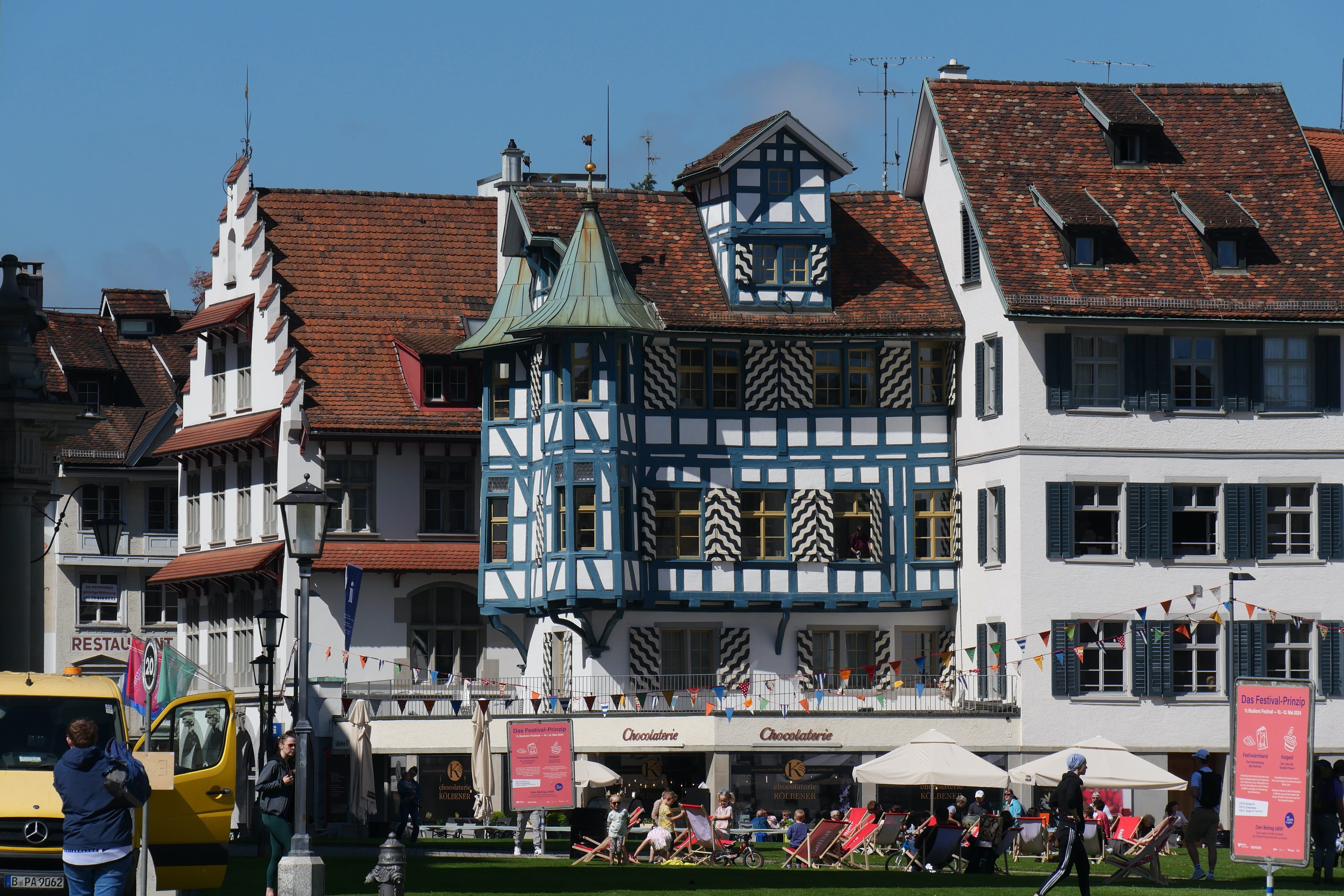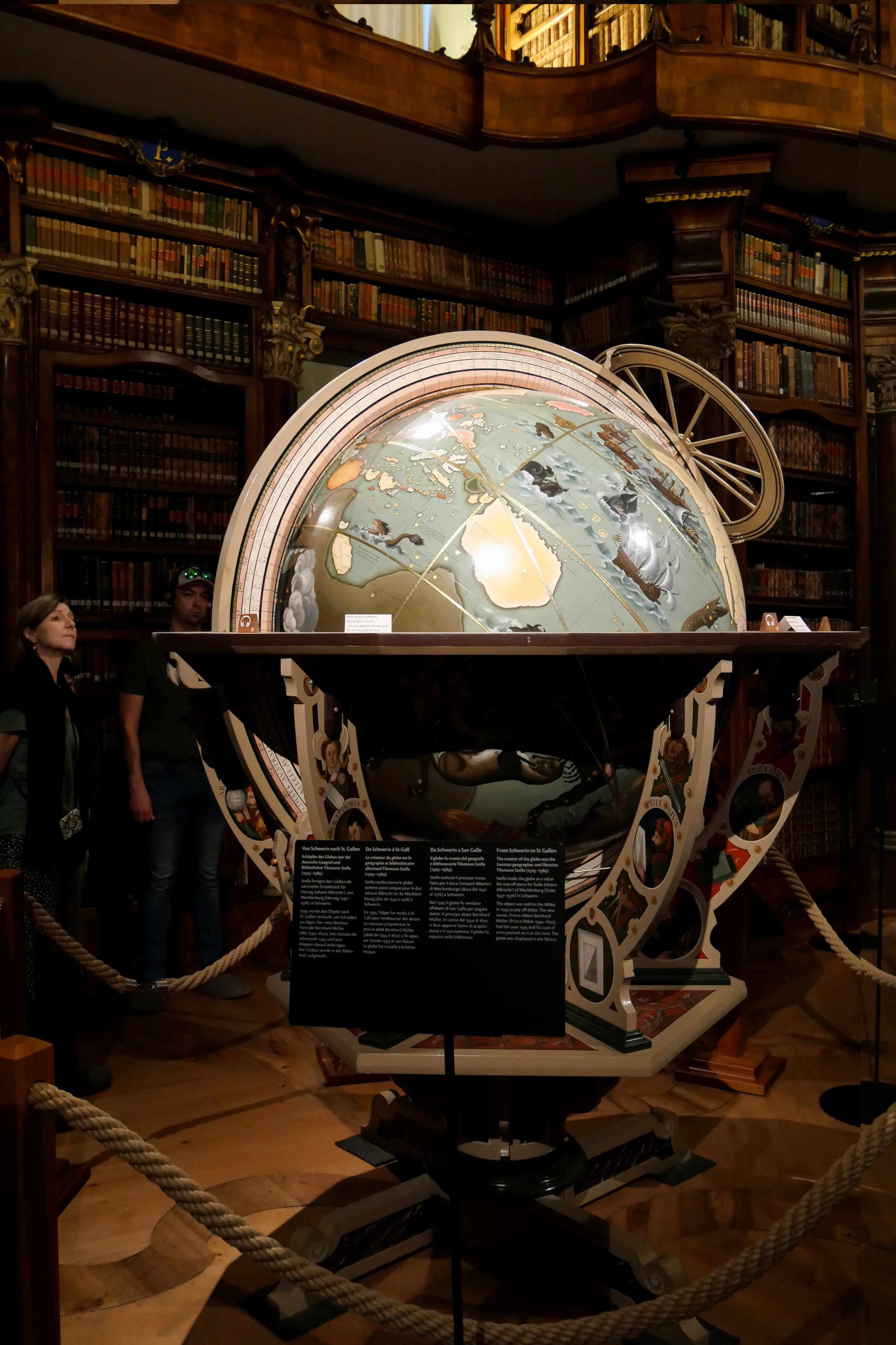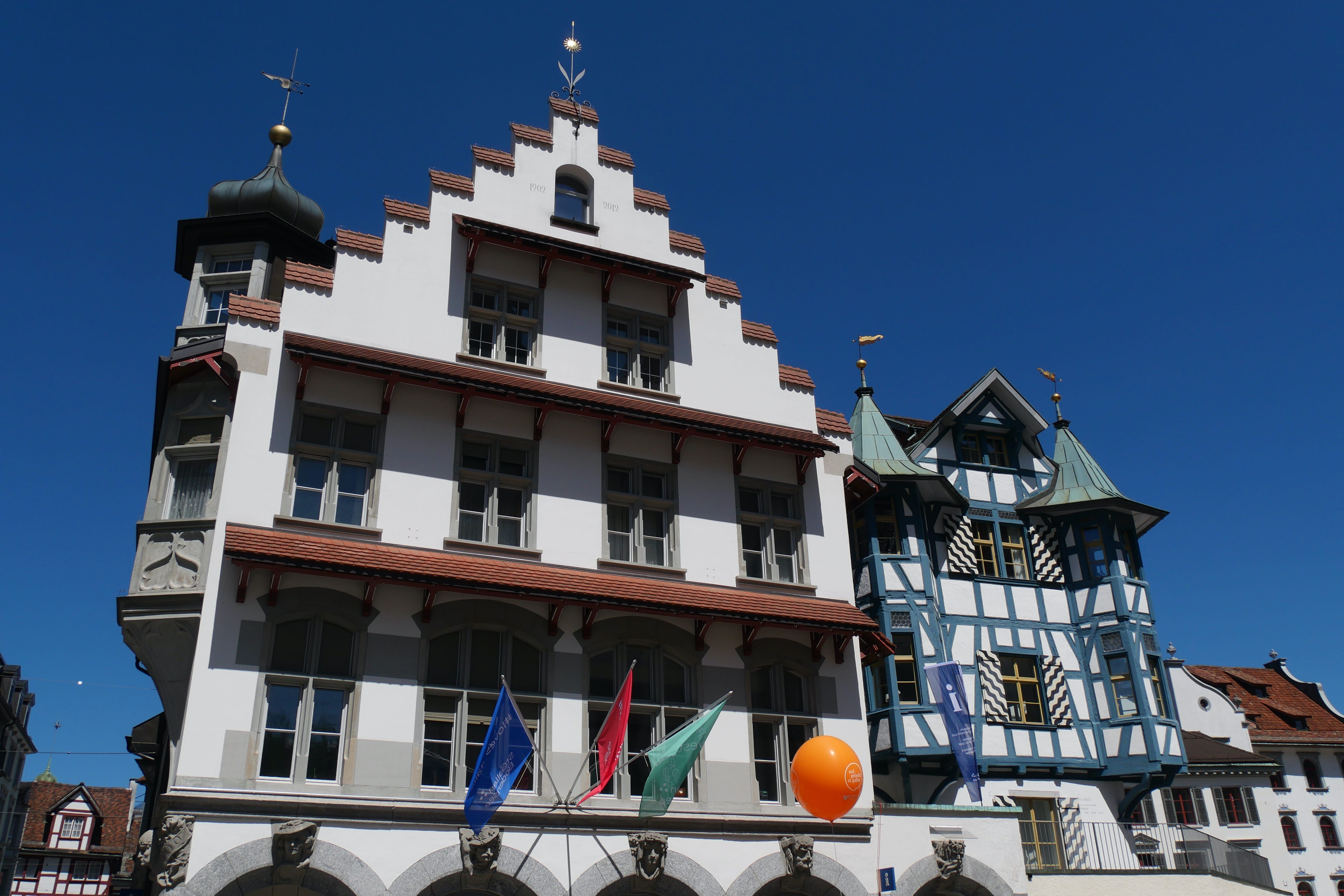 C’est sans données cellulaires, nos forfaits n’incluant pas la Suisse, que nous avons abordé la ville, à l’ancienne, en se souvenant d’où on venait et en s’orientant autant que possible avec les panneaux à disposition et les quelques souvenirs de ce que nous avions vu en arrivant en voiture. L’occasion quand même de se rappeler à quoi ressemblait la découverte avant la facilité de tout avoir à portée de mains sur son smartphone… Un poil plus compliqué peut-être, mais pas complètement déplaisant pour autant on l’avoue. Inclus dans la BCP, des audioguides récupérés à l’Office du tourisme nous ont permis de mieux comprendre certains bâtiments que nous avions vus en y allant, et se sont avérés utiles pour la visite de l’abbaye et de sa superbe bibliothèque, rendant l’expérience bien plus vivante qu’en ne lisant que les panneaux. Si le sous-sol de l’abbaye n’a rien de particulièrement intéressant, la bibliothèque mérite à elle seule le détour, avec de superbes objets comme la copie d’un énorme globe réalisé au 16ème siècle, montrant ainsi les connaissances de l’époque sur notre monde aujourd’hui bien plus cartographié. L’expérience d’y évoluer en chaussons enfilés par dessus les chaussures afin de ne pas abîmer le parquet est également assez particulière. En ressortant, nous profitons de l’animation d’une fête locale qui se prépare pour arpenter les rues adjacentes, certaines façades de maison étant assez typiques et jolies à contempler.