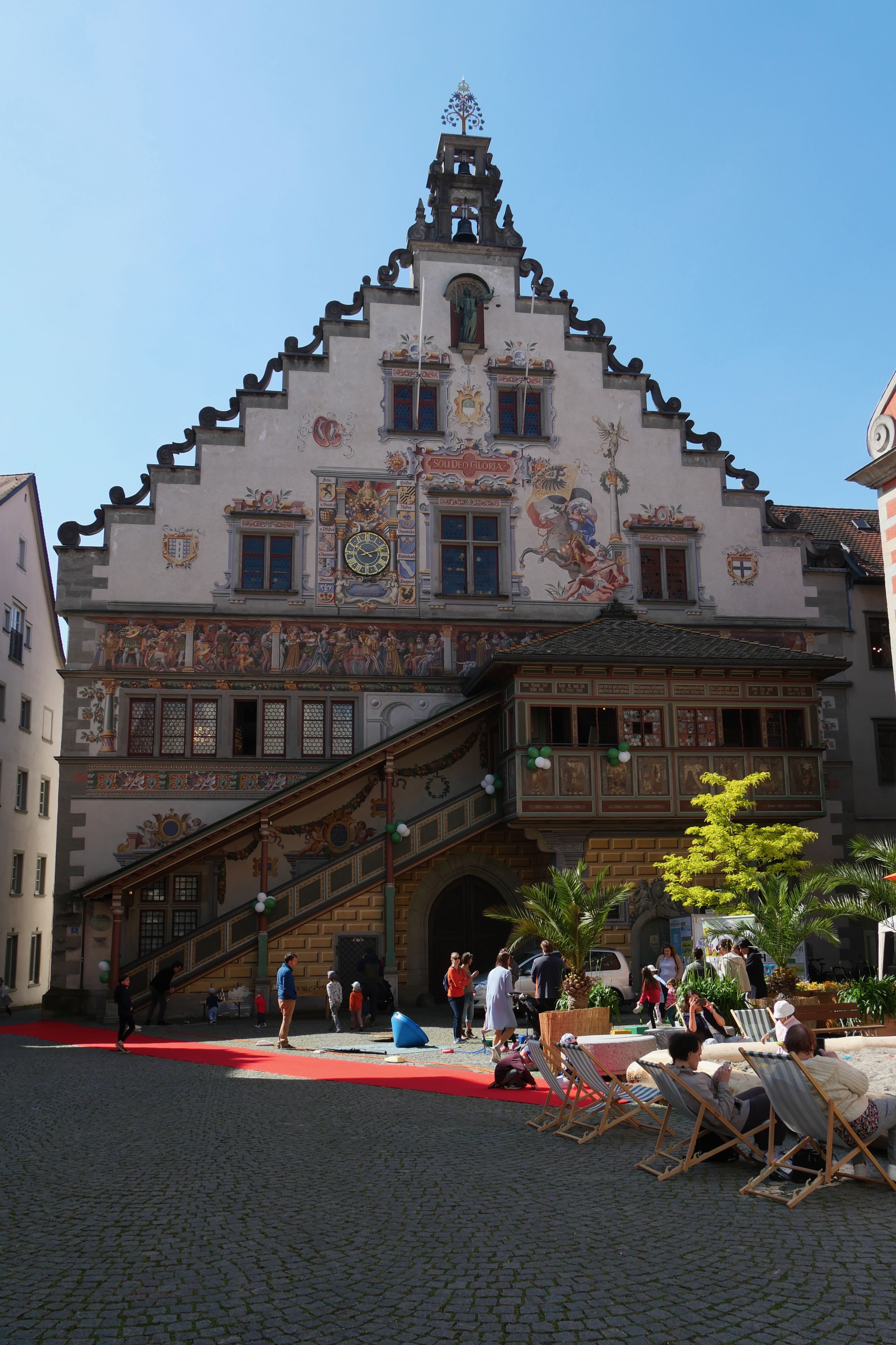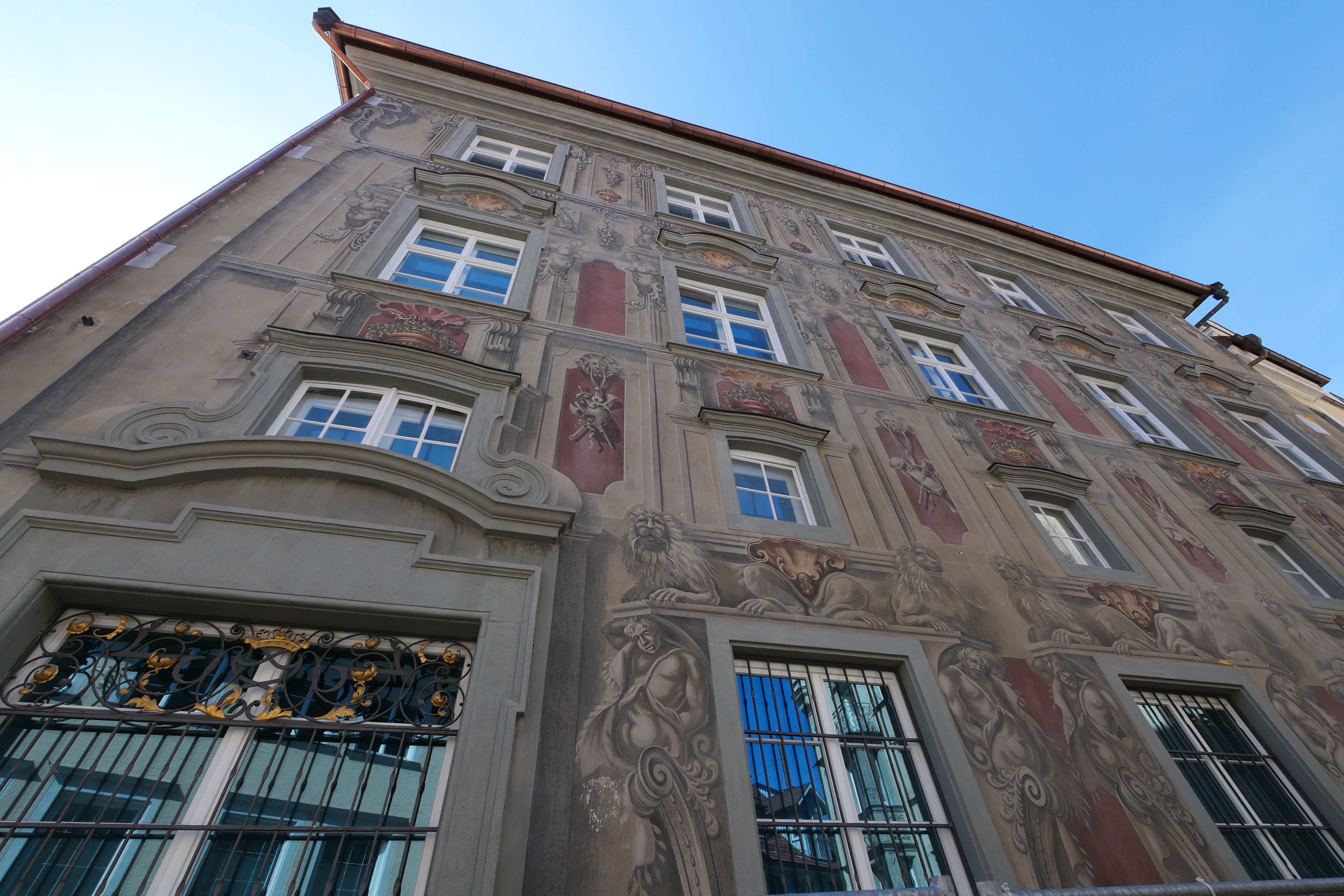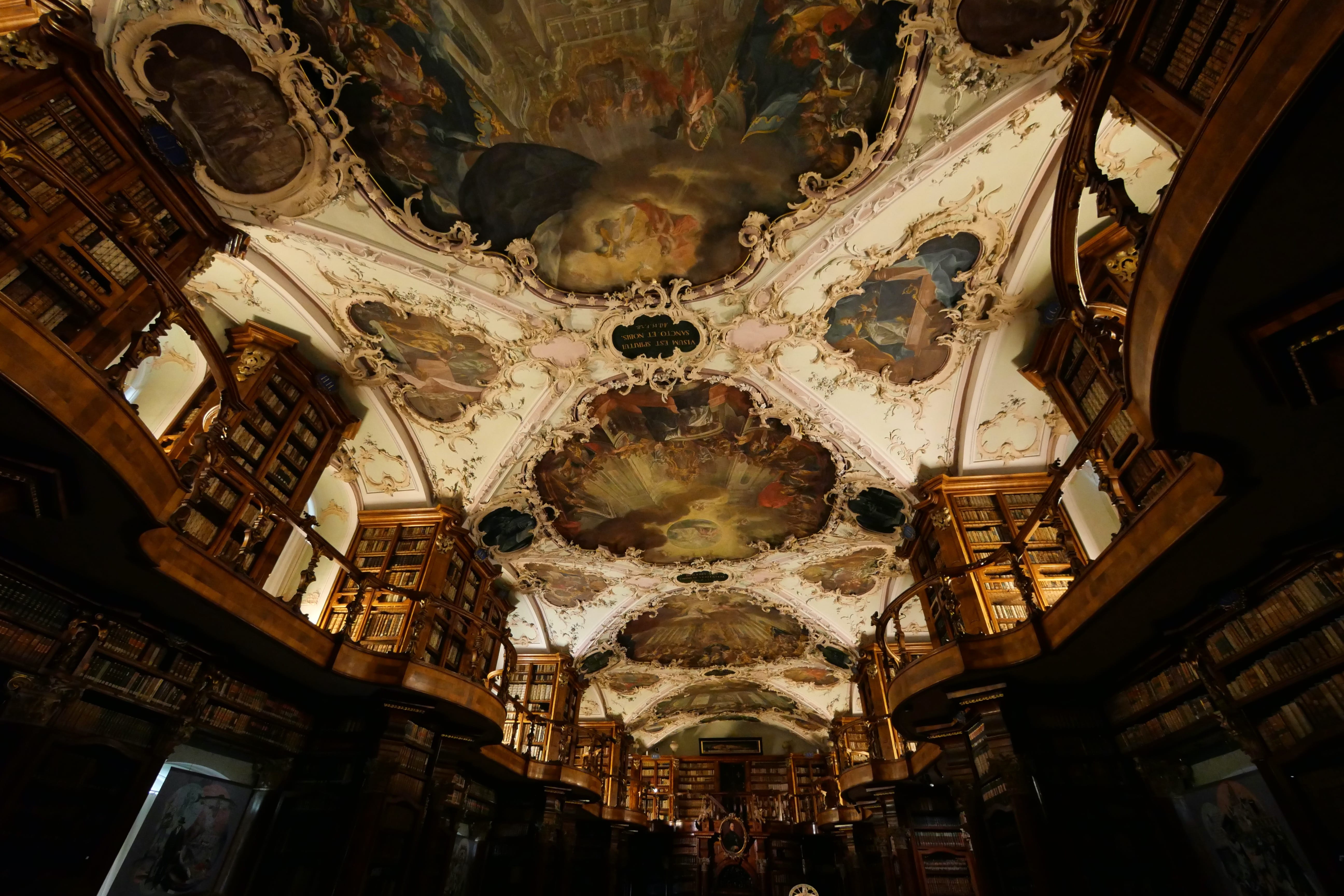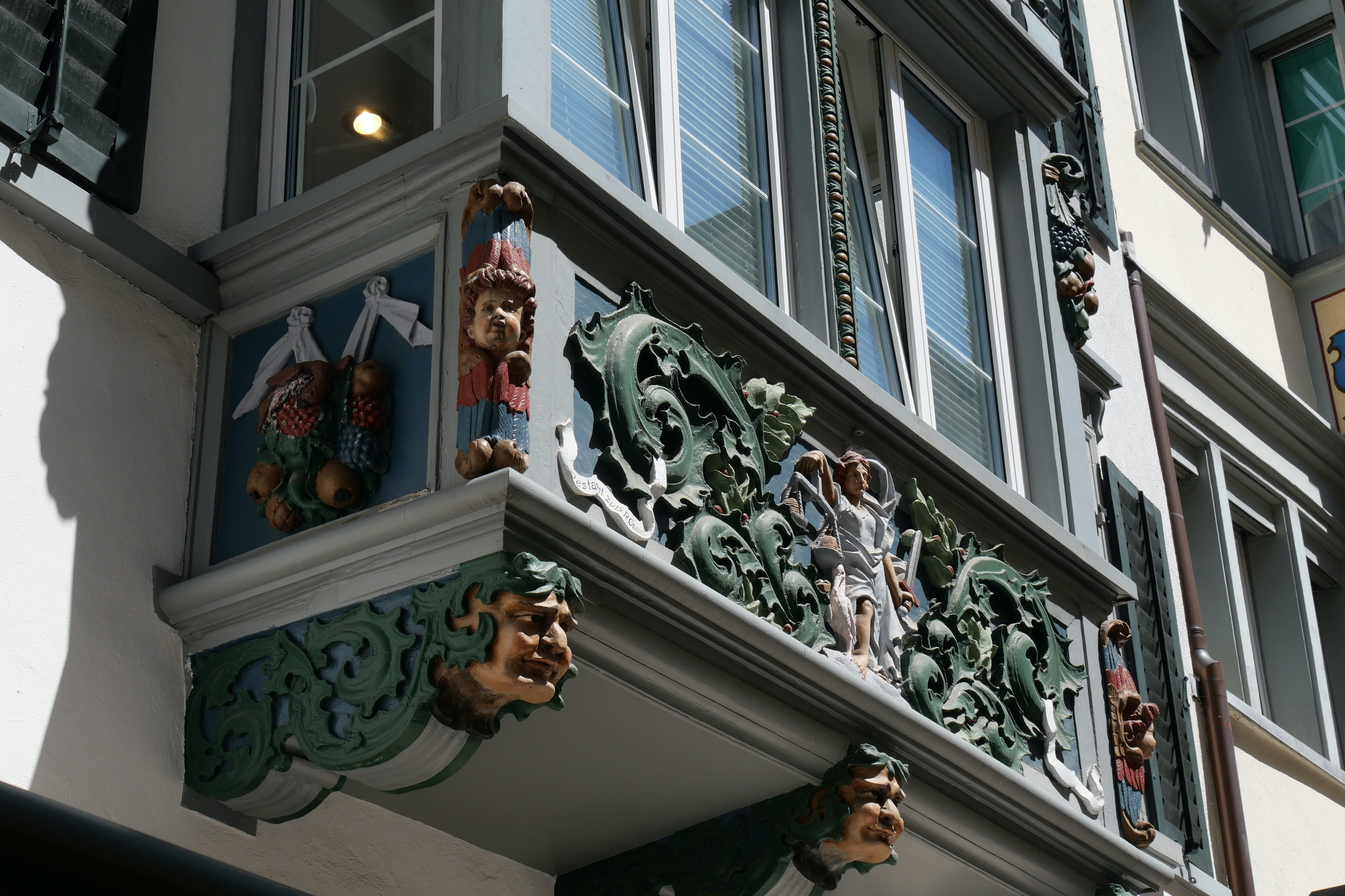 C’est sans données cellulaires, nos forfaits n’incluant pas la Suisse, que nous avons abordé la ville, à l’ancienne, en se souvenant d’où on venait et en s’orientant autant que possible avec les panneaux à disposition et les quelques souvenirs de ce que nous avions vu en arrivant en voiture. L’occasion quand même de se rappeler à quoi ressemblait la découverte avant la facilité de tout avoir à portée de mains sur son smartphone… Un poil plus compliqué peut-être, mais pas complètement déplaisant pour autant on l’avoue. Inclus dans la BCP, des audioguides récupérés à l’Office du tourisme nous ont permis de mieux comprendre certains bâtiments que nous avions vus en y allant, et se sont avérés utiles pour la visite de l’abbaye et de sa superbe bibliothèque, rendant l’expérience bien plus vivante qu’en ne lisant que les panneaux. Si le sous-sol de l’abbaye n’a rien de particulièrement intéressant, la bibliothèque mérite à elle seule le détour, avec de superbes objets comme la copie d’un énorme globe réalisé au 16ème siècle, montrant ainsi les connaissances de l’époque sur notre monde aujourd’hui bien plus cartographié. L’expérience d’y évoluer en chaussons enfilés par dessus les chaussures afin de ne pas abîmer le parquet est également assez particulière. En ressortant, nous profitons de l’animation d’une fête locale qui se prépare pour arpenter les rues adjacentes, certaines façades de maison étant assez typiques et jolies à contempler.