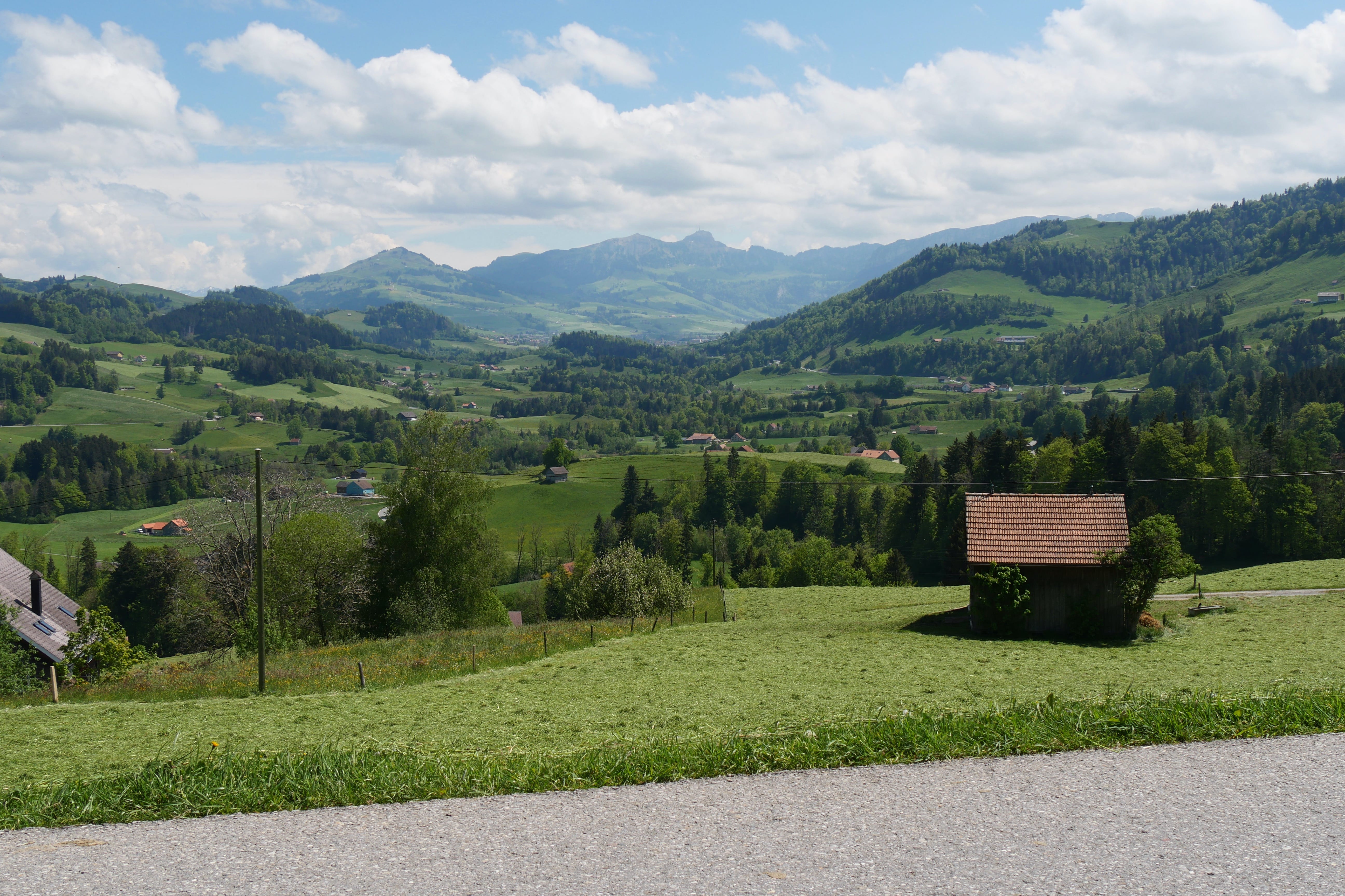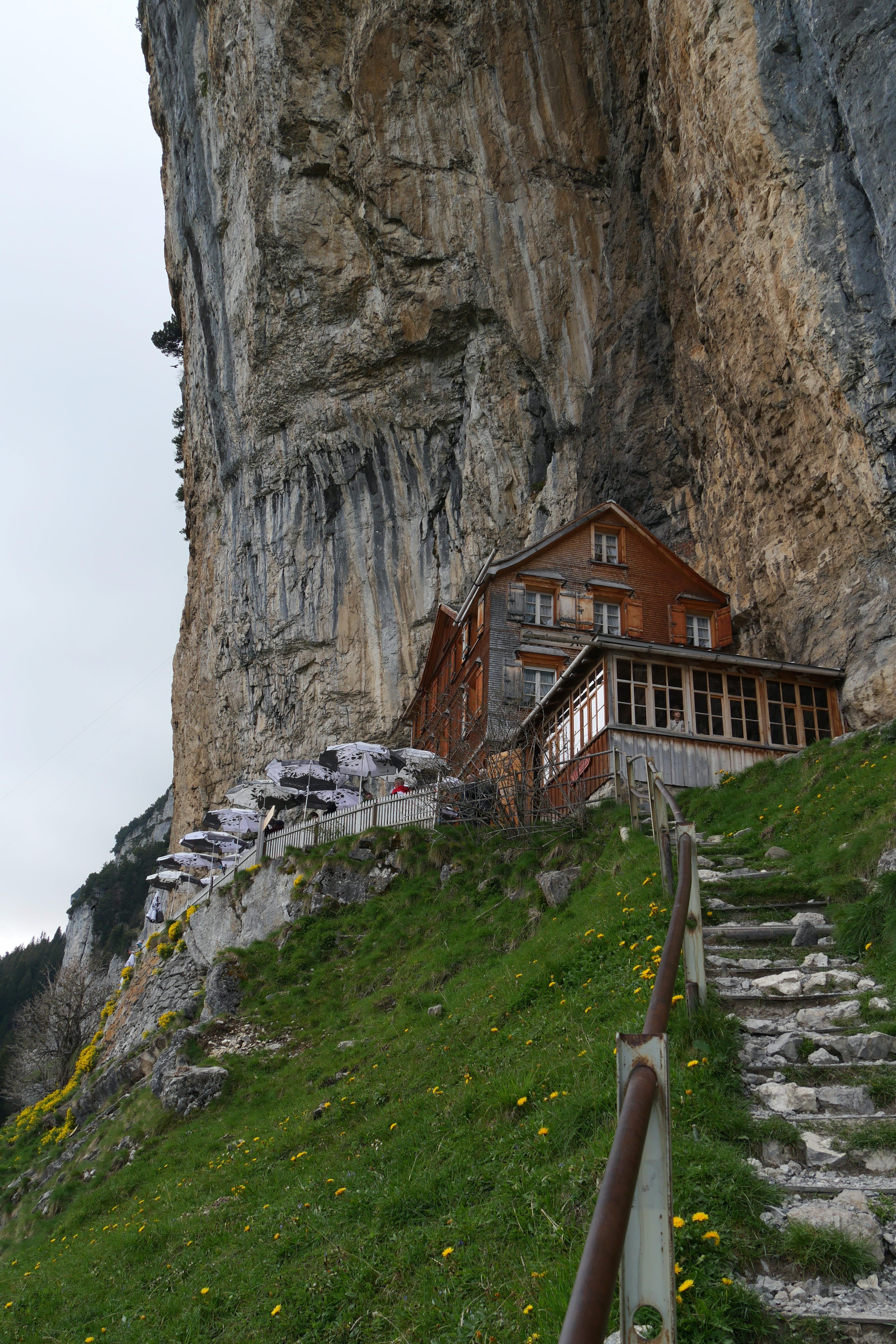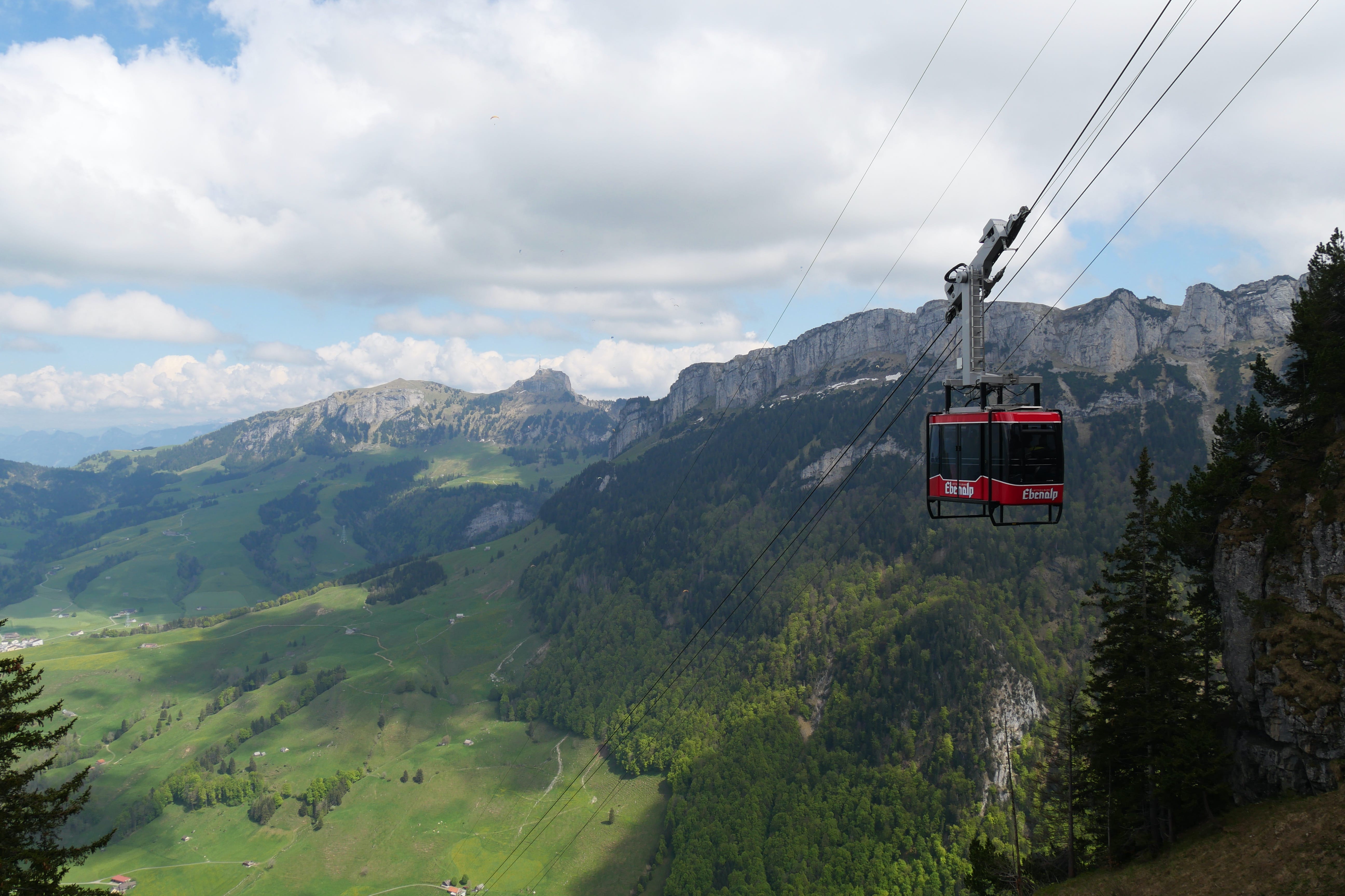 Après avoir fait notre pause de midi dans le village bien calme, nous reprenons la route, plus sinueuse, jusqu’à atteindre le bout de la vallée dans laquelle se situe le téléphérique pour l’Ebenalp. C’est en compagnie d’une dizaine de parapentistes que nous montons à bord du téléphérique (qui à lui seul coûte déjà 36CHF A/R pour un adulte, et est inclus dans la BCP) pour quelques minutes de montée, jusqu’à atteindre le début de notre petite randonnée nous amenant jusqu’à l’auberge Aescher, célèbre pour son incrustation dans la roche. Avant cela, nous traversons le Wildkirchli, un réseau de grottes reliées entre elles, nous faisant ressortir à flanc de falaise. On ne vous le cache pas, il faut tout de même une condition physique correcte pour s’aventurer en montagne, et c’est en accord avec nos limites que nous avions tracé notre petite boucle. Quand bien même, il aura fallu s’accrocher avec le dénivelé positif et la technicité de certains passages sur le retour pour ne pas retenir que cela de notre expérience. Le paysage est cependant à couper le souffle et nous aura fait assez vite oublier nos efforts pour y arriver. Nous redescendrons par le même chemin, en téléphérique, mais il est également possible de rejoindre la vallée par un sentier de randonnée passant à proximité d’un magnifique lac que nous n’aurons fait qu’apercevoir d’en haut. Sur le retour, Il, avait évoqué l’existence du Chocolarium, une visite de la chocolaterie de Flawil, enrichie d’expériences autour du chocolat, pour petits et plus grands. Elle, était donc tentée par découvrir cet univers, en lien direct avec sa passion pour la pâtisserie, mais nous sommes arrivés à moins d’une heure de la fermeture et nous sommes donc vus refuser l’accès, sans négociation possible. Bons joueurs, nous avons tout de même cédés à quelques achats à la boutique d’usine, aux tarifs pour certains intéressants.