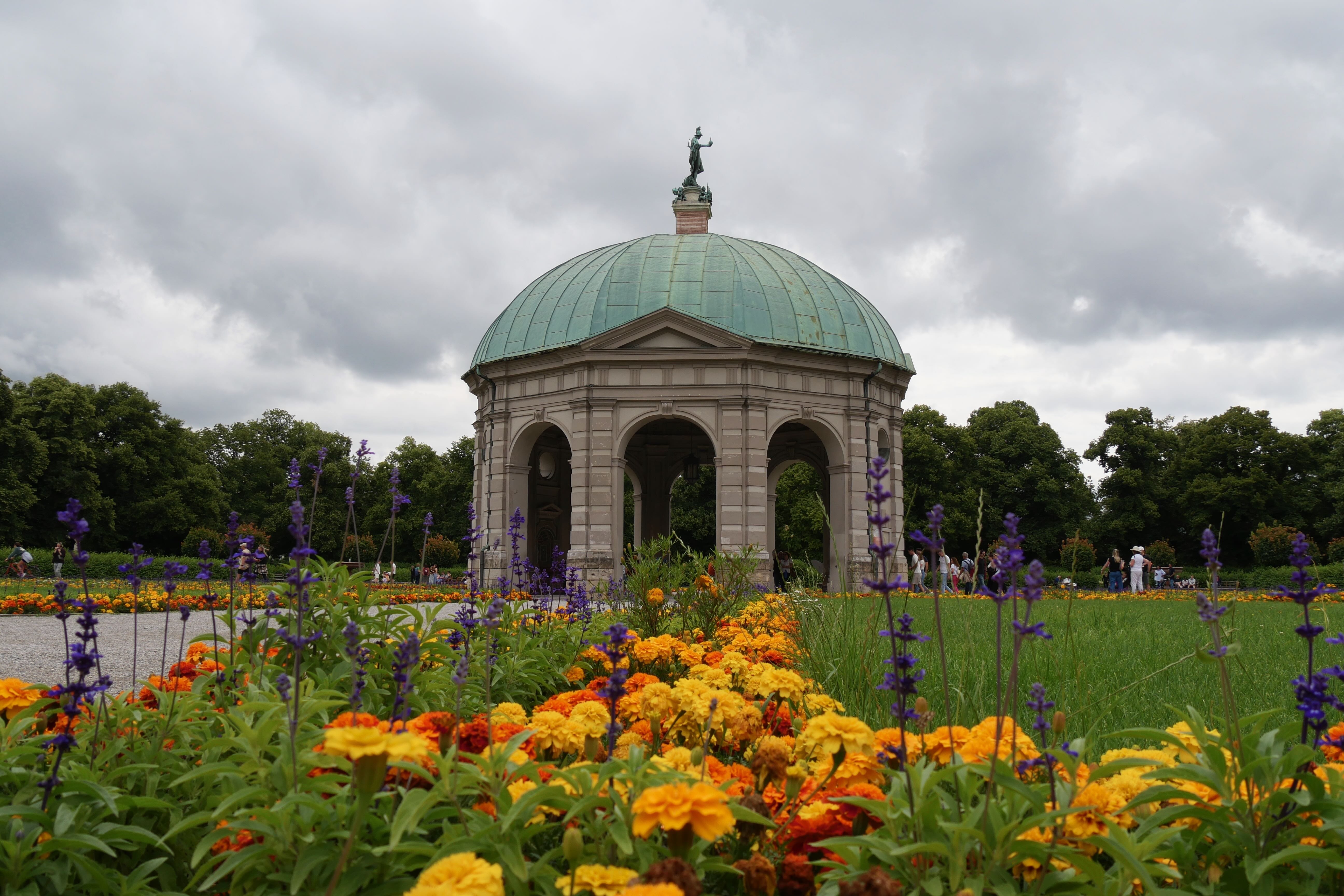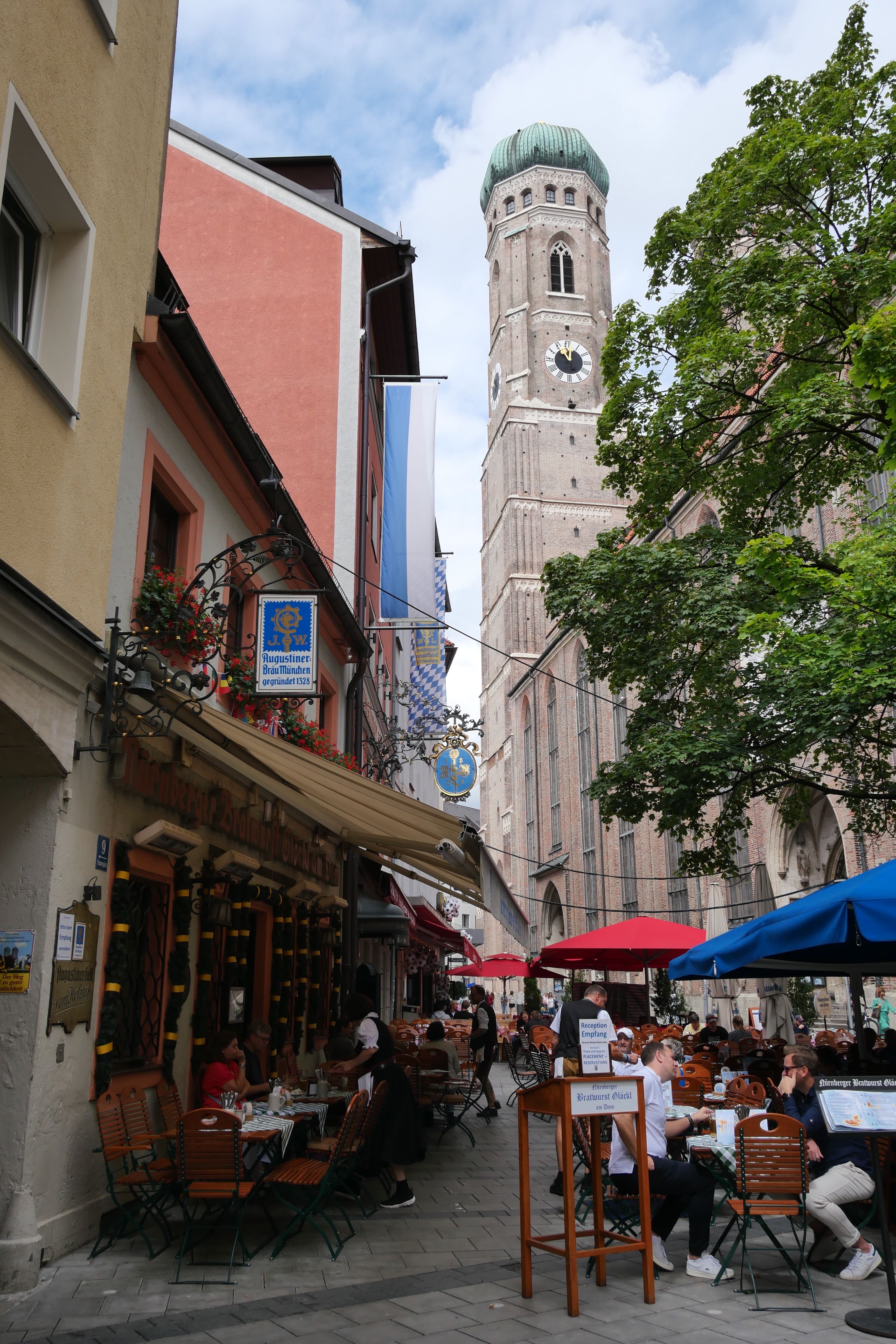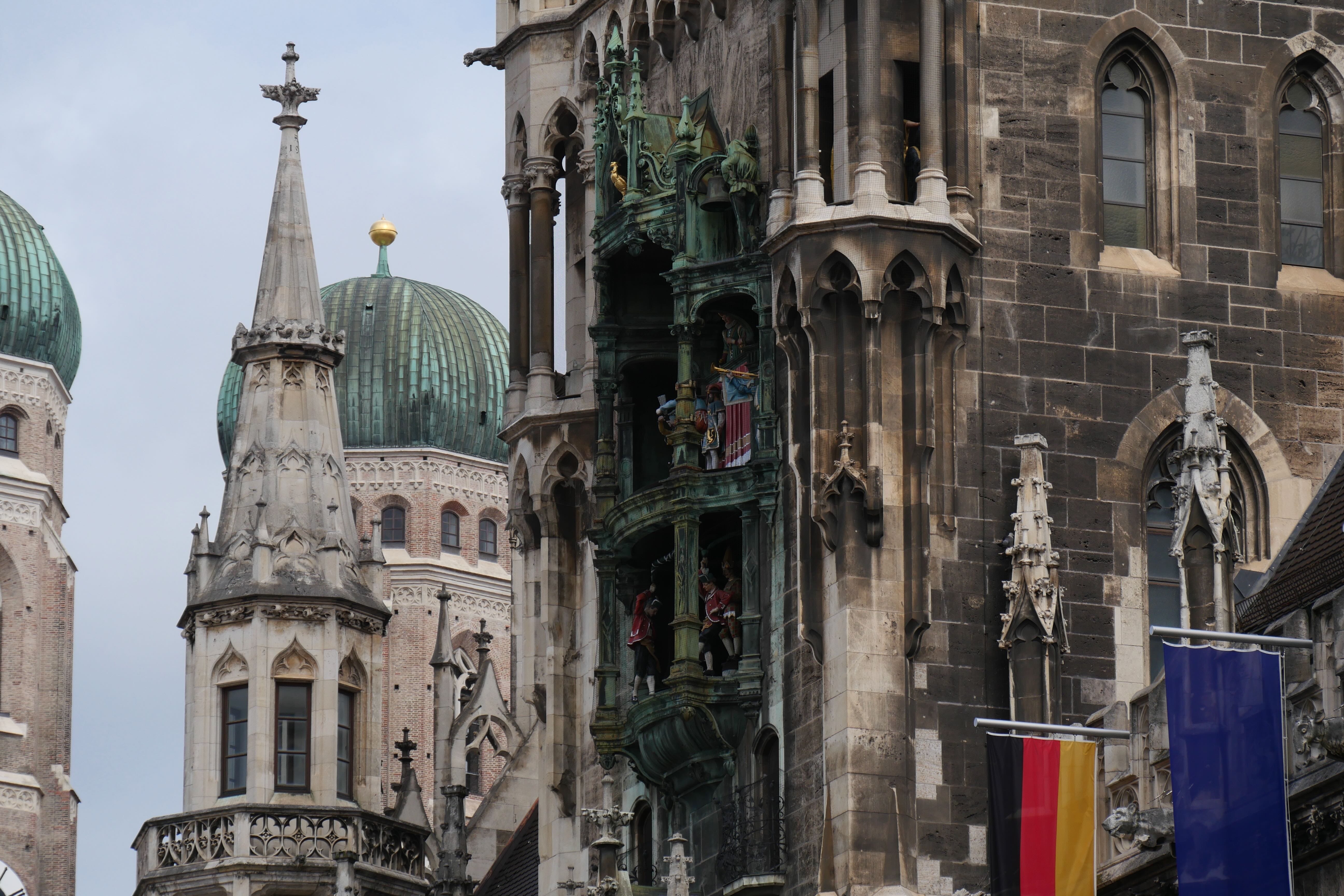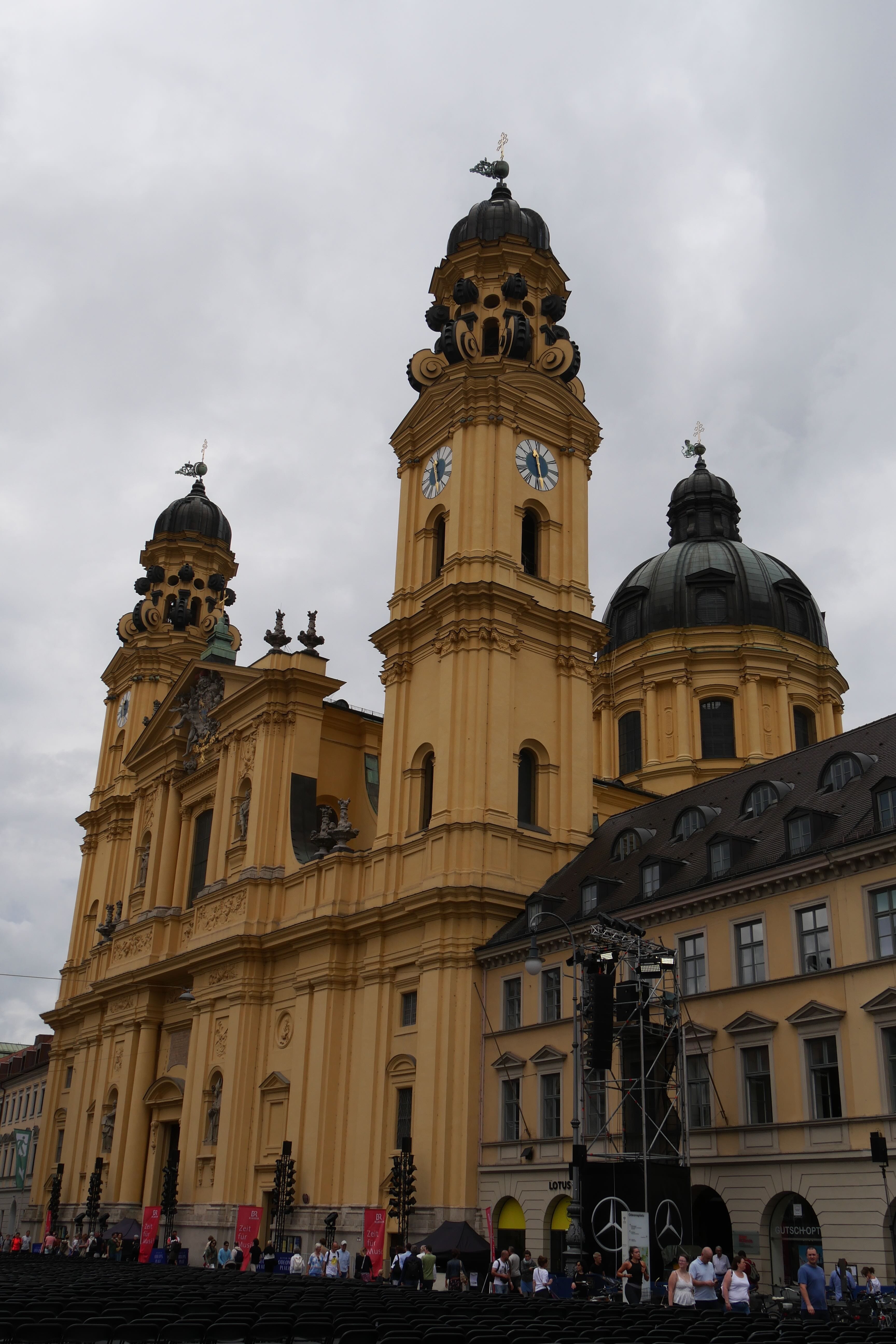 Marienplatz était un peu le point de retour de toutes les visites. On y repassera une seconde fois en direction de Frauenkirschen, église surmontée de deux tours à petite coupole. Après une visite rapide de l’intérieur, retour à Marienplatz encore, en passant à chaque fois par d’autres charmantes rues. Cette fois, on l’admire davantage et on s’attarde devant le Glockenspiel, le carillon qui se met en action tous les jours à 11h et 12h, toute l’année, et à 17h de mars à octobre. Au centre, il nous reste encore à voir Odeonsplatz et la Résidence. La place est occupée ce jour-là par des centaines de chaises, un concert de musique classique se préparant. On admirera tout de même la très jolie église de l’extérieur avant d’aller faire un tour dans Hofgarten.