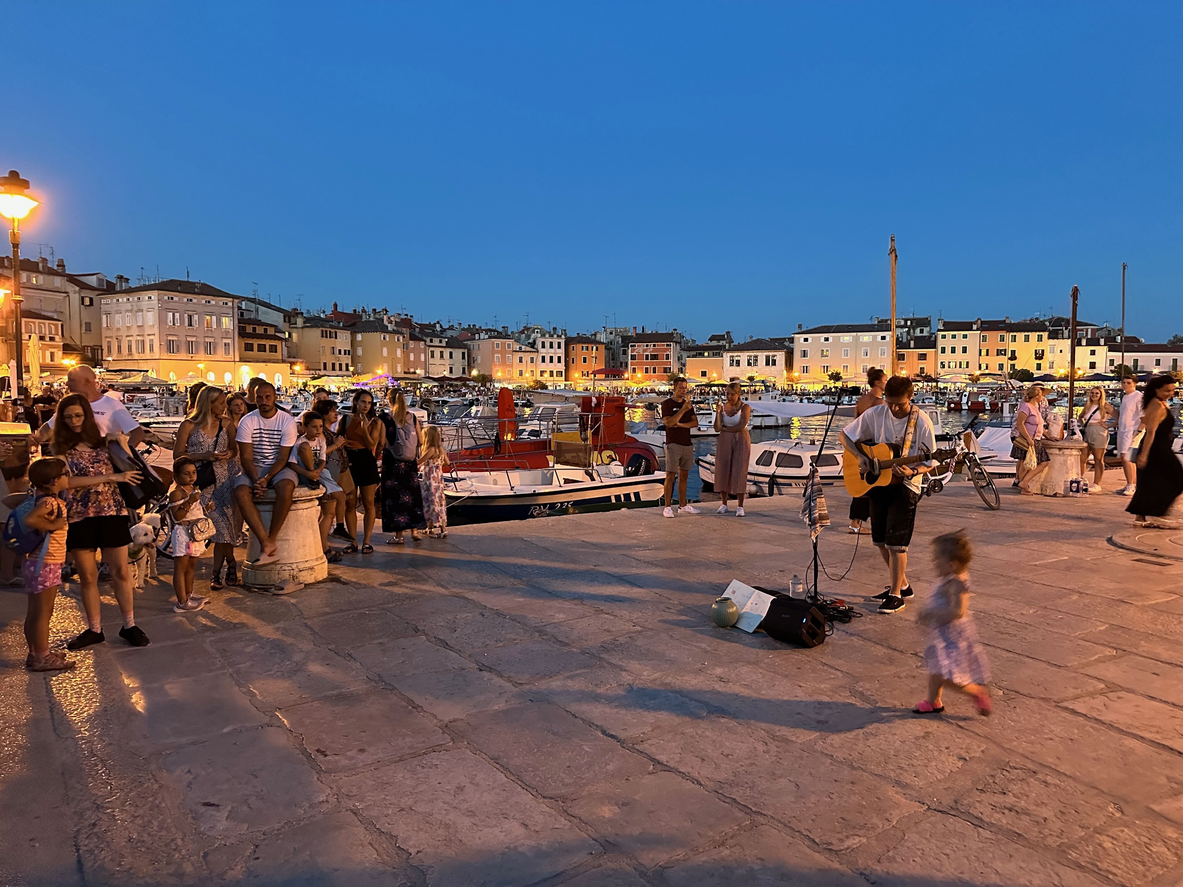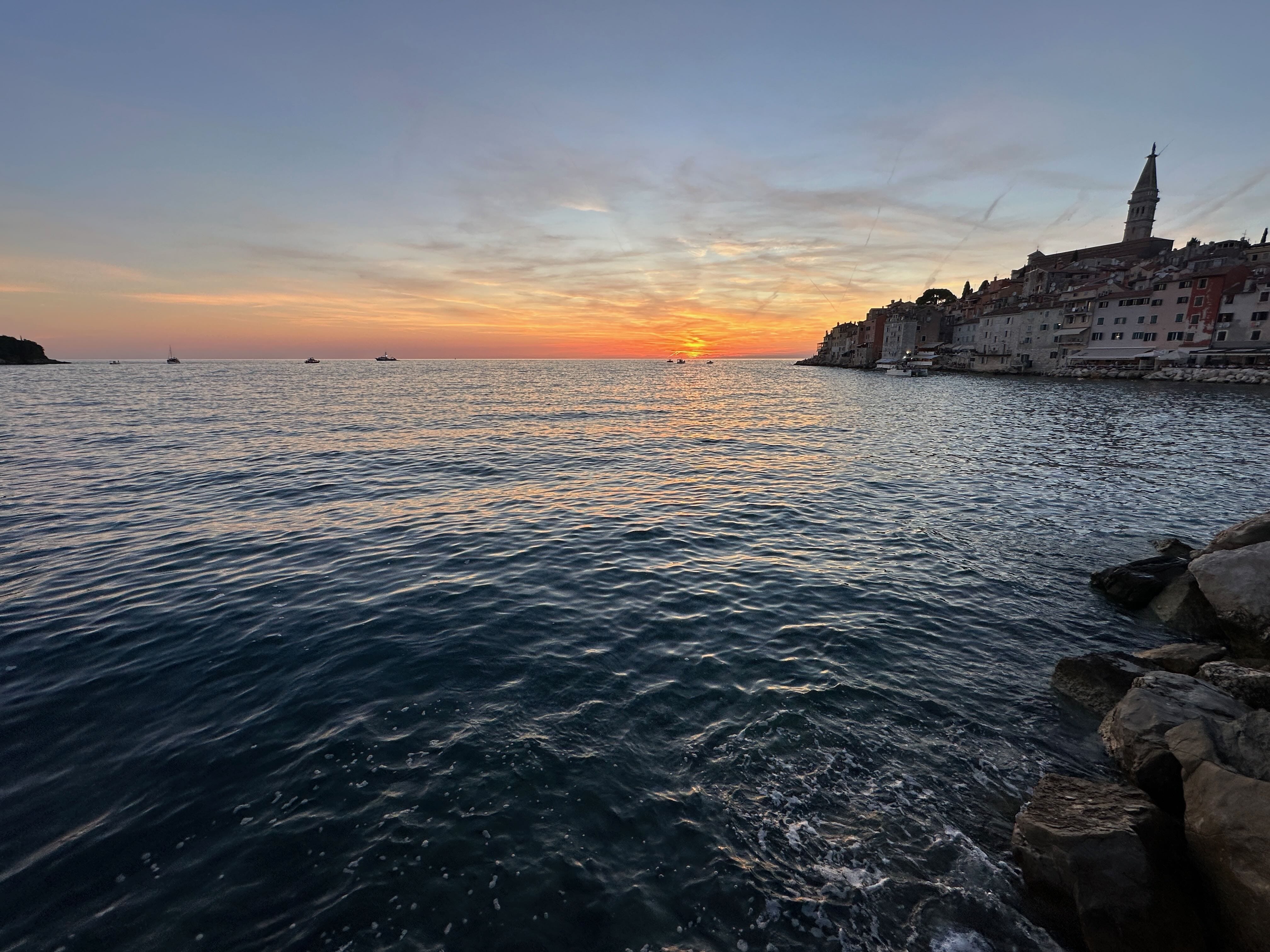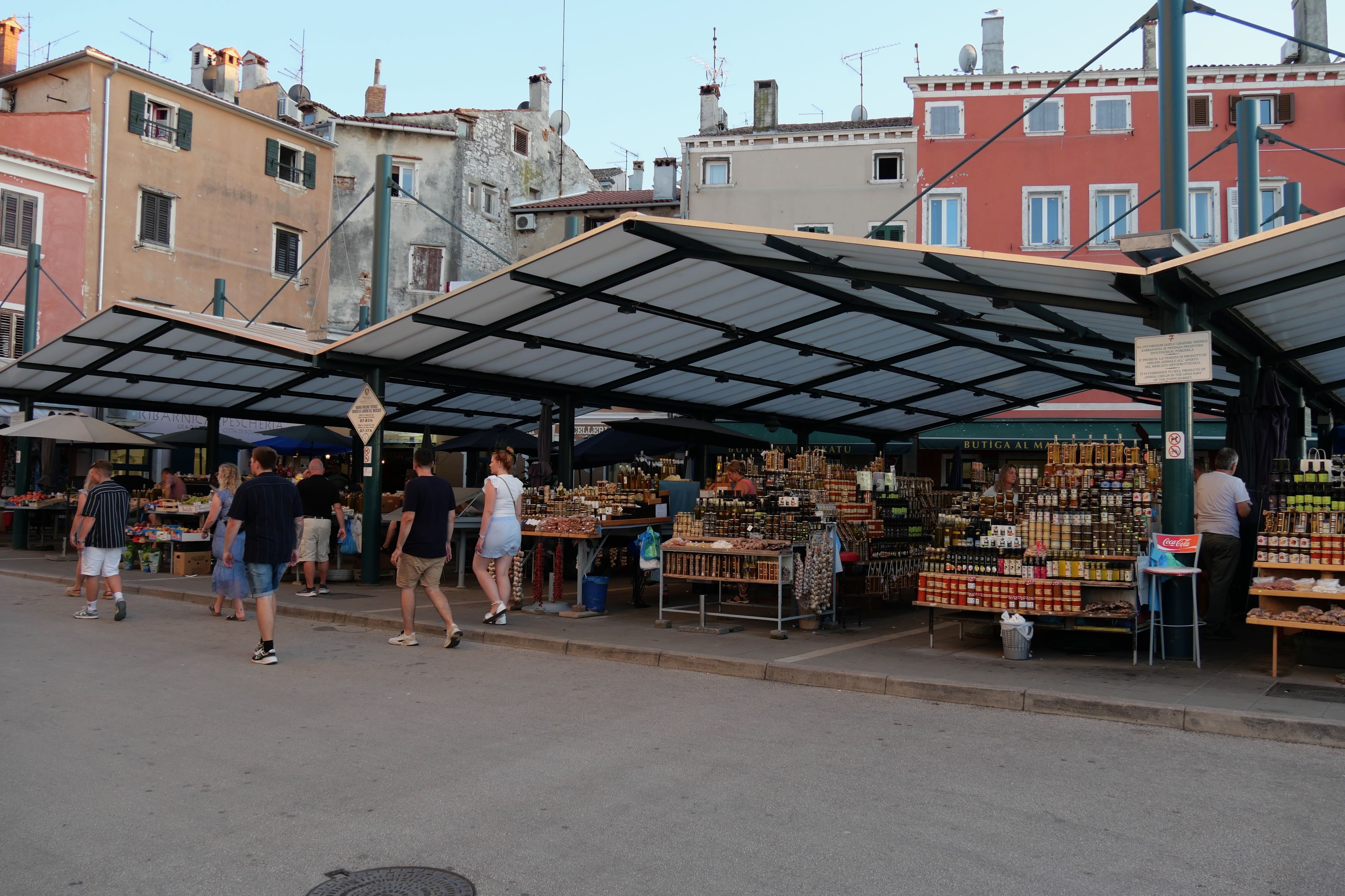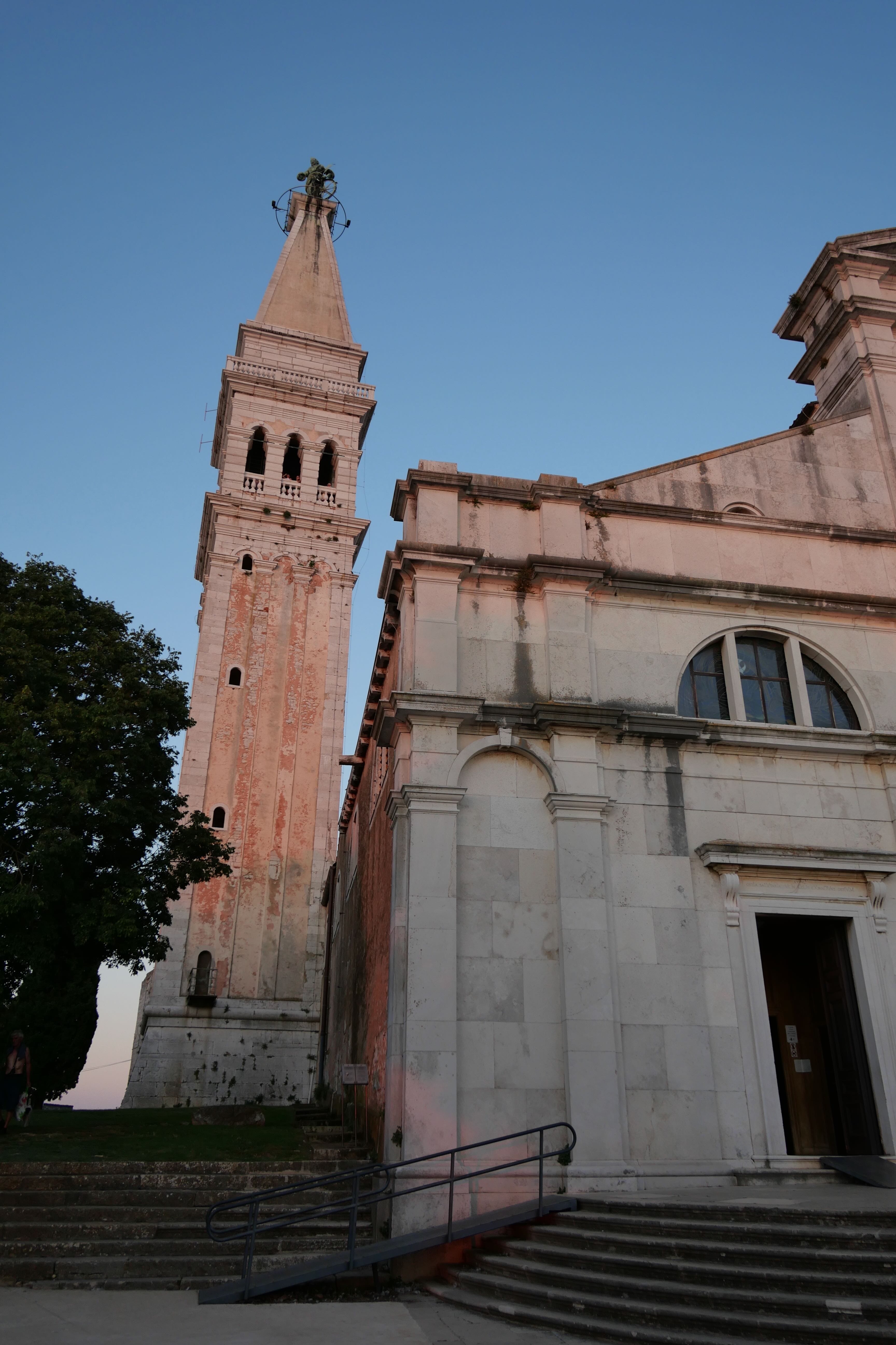 On ressortira dans Rovinj pour la soirée, après un passage à notre logement, pour pouvoir en profiter encore un peu de jour et notamment découvrir le marché. A priori, en été, pas besoin de se presser. Les stands sont ouverts jusqu’à 23h, si vous cherchez des souvenirs (alimentaires ou autres) à rapporter dans vos valises. Malgré la chaleur toujours bien présente, on fera encore un peu de grimpette jusqu’à la cathédrale, ce qui nous permettra d’admirer un second coucher de soleil magnifique. Le campanile semblait encore accessible, malgré l’heure tardive, tout comme son tarif de 4€, mais les 189 marches à gravir auront fini de nous convaincre de passer sur l’occasion. Après avoir déambulé au gré des ruelles et retrouvé Ombra pour une glace rafraîchissante, on finira sur la jolie place Marsala Tita, au bord de l’eau mais malheureusement en travaux à ce moment-là. Nous profiterons quand même du beau clocher de la tour de l’horloge et de l’arche Balbi (ou du moins leur partie haute, le reste étant masqué par des grillages). Une bonne journée de vacances bien remplie s’achèvera ainsi.