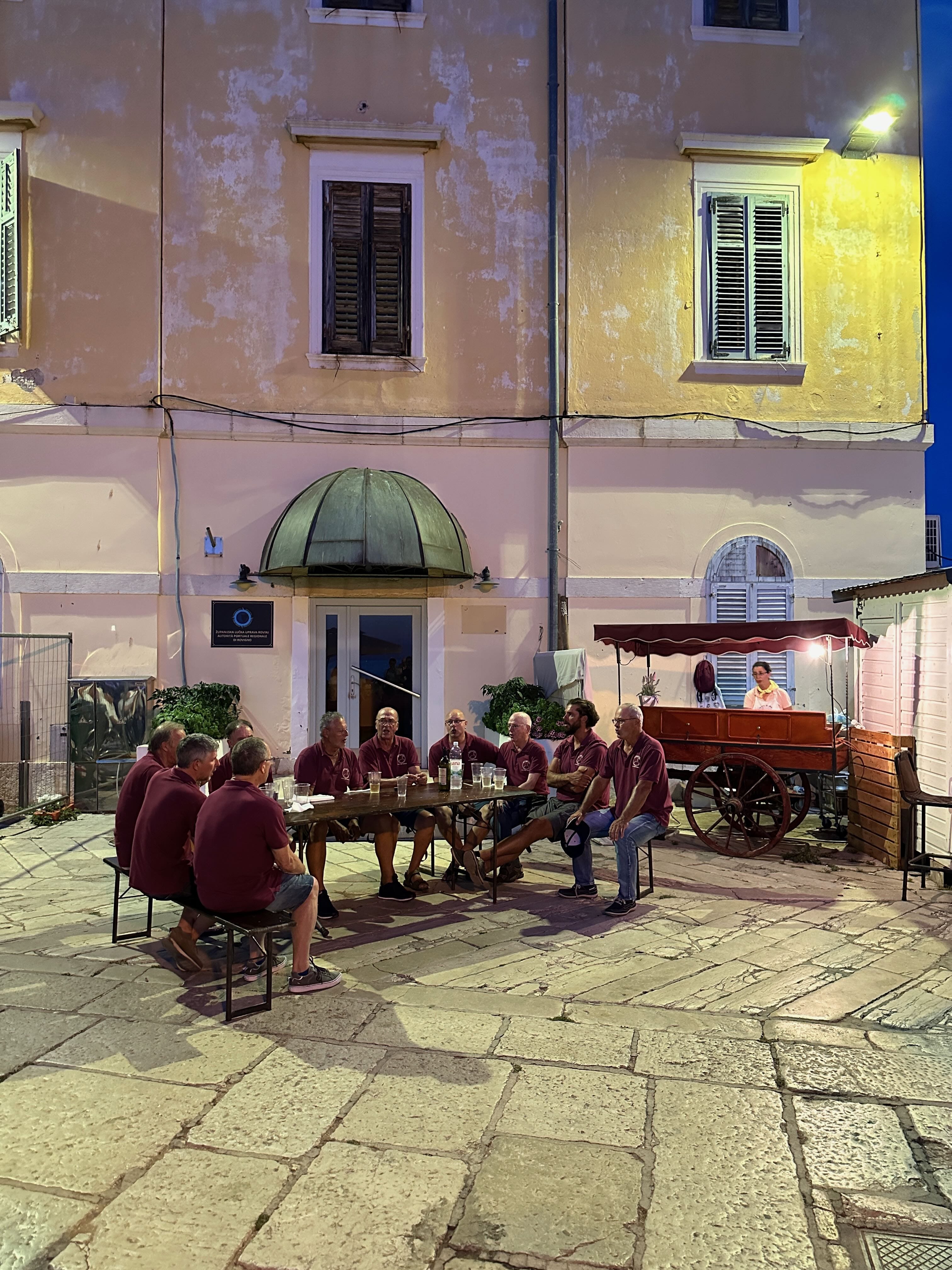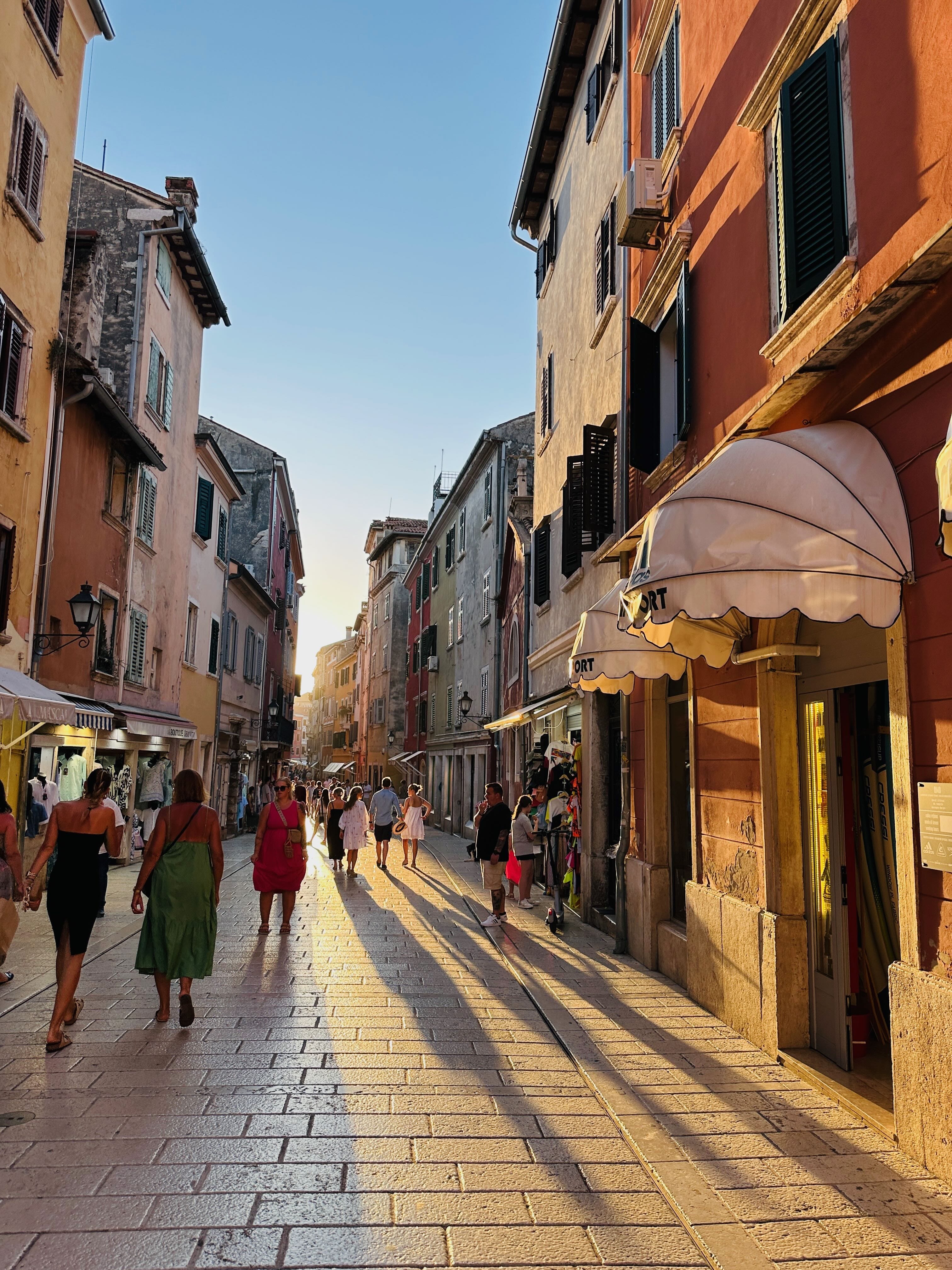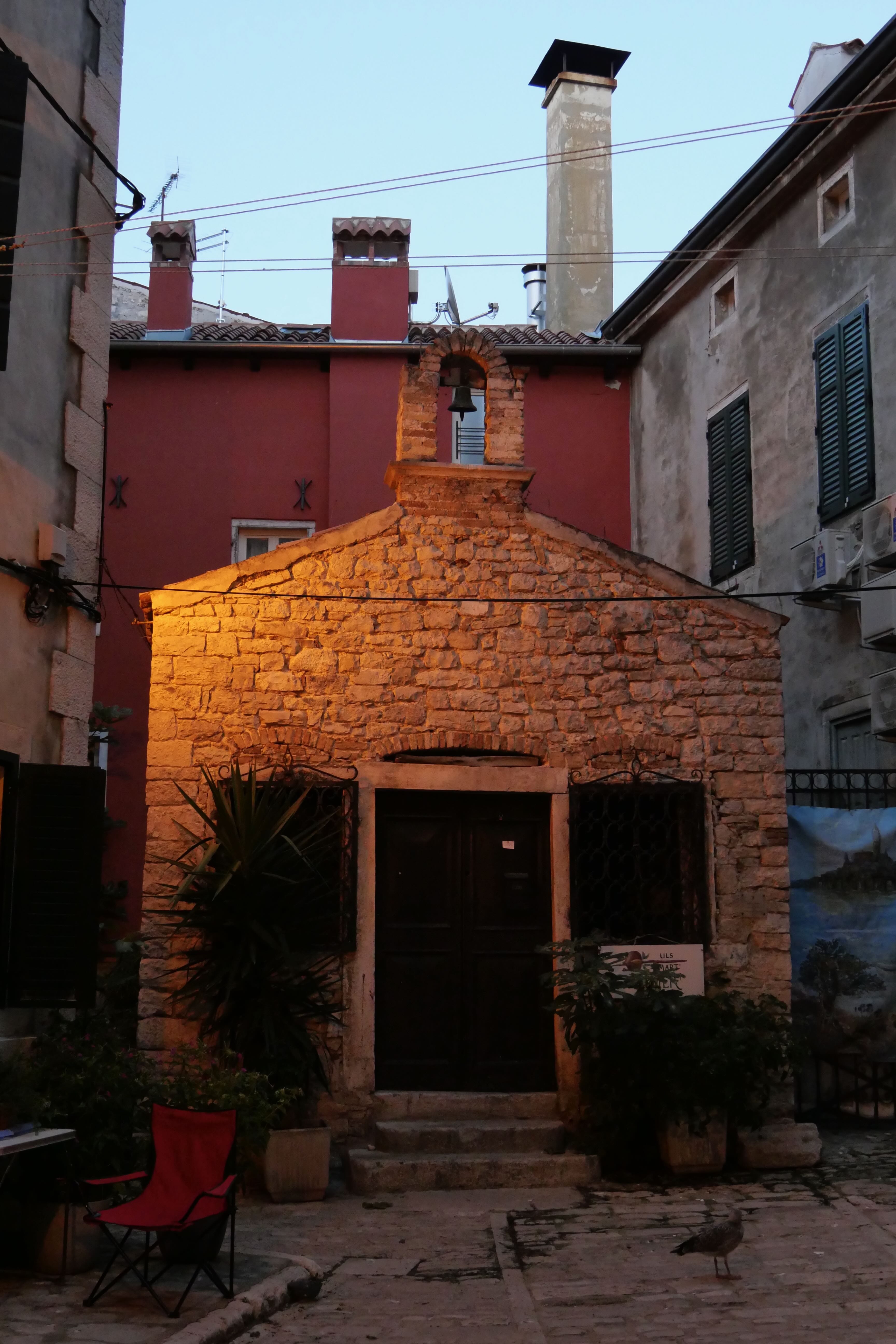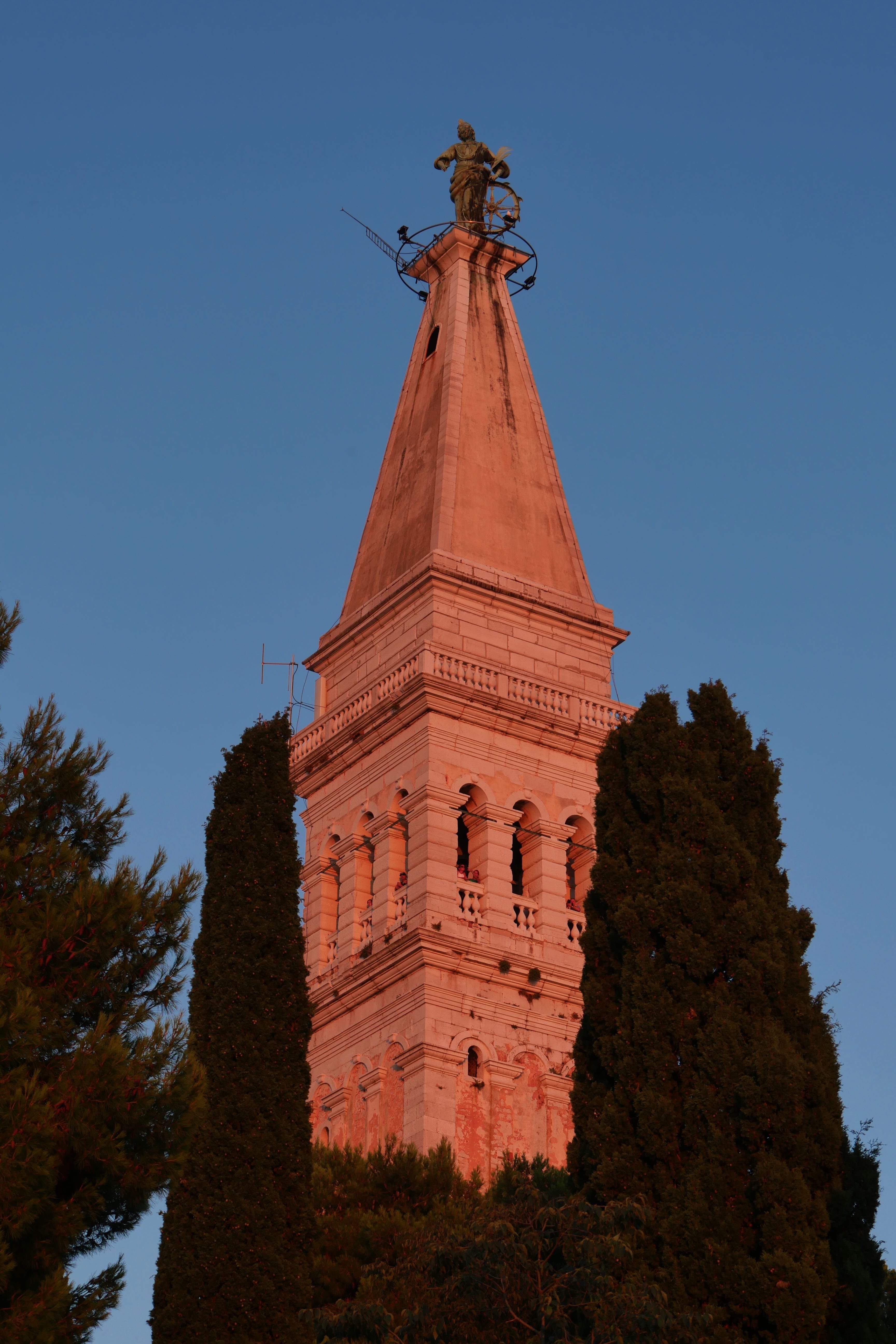 On ressortira dans Rovinj pour la soirée, après un passage à notre logement, pour pouvoir en profiter encore un peu de jour et notamment découvrir le marché. A priori, en été, pas besoin de se presser. Les stands sont ouverts jusqu’à 23h, si vous cherchez des souvenirs (alimentaires ou autres) à rapporter dans vos valises. Malgré la chaleur toujours bien présente, on fera encore un peu de grimpette jusqu’à la cathédrale, ce qui nous permettra d’admirer un second coucher de soleil magnifique. Le campanile semblait encore accessible, malgré l’heure tardive, tout comme son tarif de 4€, mais les 189 marches à gravir auront fini de nous convaincre de passer sur l’occasion. Après avoir déambulé au gré des ruelles et retrouvé Ombra pour une glace rafraîchissante, on finira sur la jolie place Marsala Tita, au bord de l’eau mais malheureusement en travaux à ce moment-là. Nous profiterons quand même du beau clocher de la tour de l’horloge et de l’arche Balbi (ou du moins leur partie haute, le reste étant masqué par des grillages). Une bonne journée de vacances bien remplie s’achèvera ainsi.