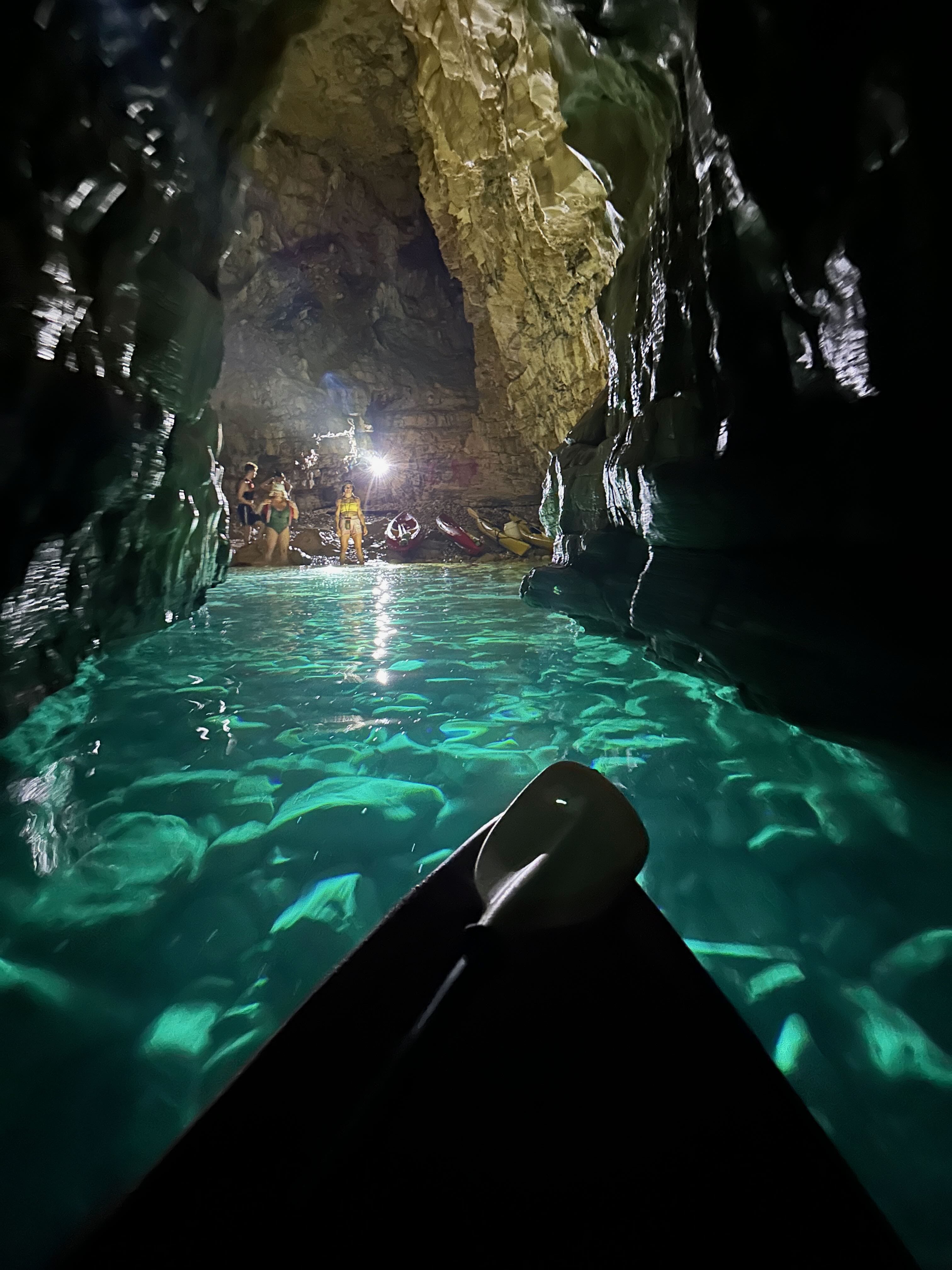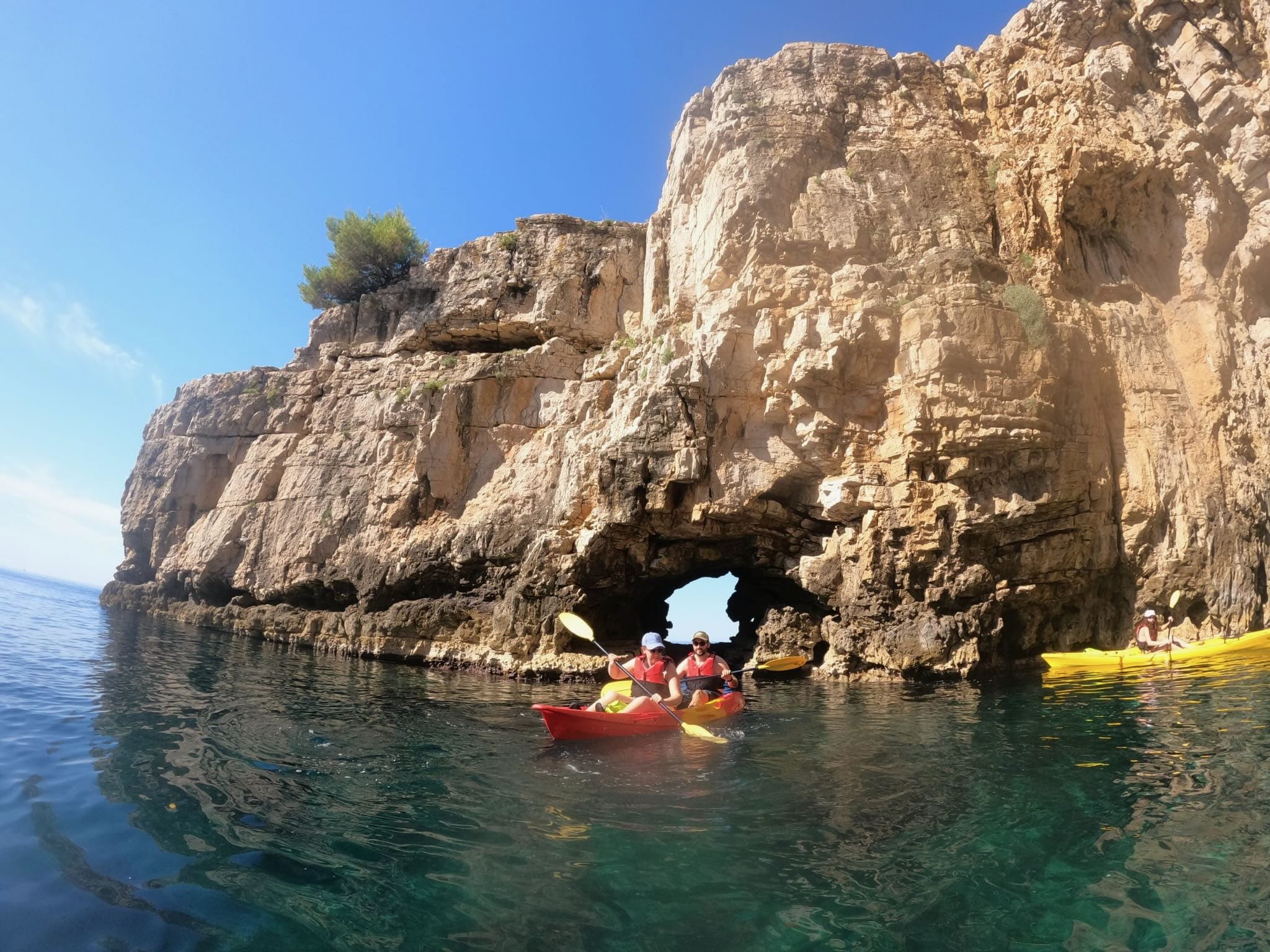 La veille, l’organisateur, Denis, nous a appelé pour fixer les derniers détails et s’assurer que nous avions bien reçu les instructions. Rdv à 8h30 donc, au Big Mama Beach bar, point de départ de l’excursion. On appréciera le parking gratuit à côté et ombragé pour les plus matinaux. Denis propose une excursion à 9h et une à 16h. On ne regrettera pas d’avoir choisi la première et d’avoir démarré une dizaine de minutes en avance car à peine 5 min derrière nous, ce sont des dizaines d’autres kayaks qui s’élancent sur l’eau. En plus, nous ne serons qu’un petit groupe de sept personnes. Parfait pour la découverte de la grotte aux pigeons (bah oui y’a des pigeons qui nichent devant 😒). Notre guide, collègue de Denis, prendra les devants pour aller illuminer l’eau qui révélera ses belles nuances de bleu. Après quelques explications et photos, nous remontons à bord vers un second arrêt, l’œil du diable. C’est en fait un trou dans la roche, presque au niveau de l’eau. La guide nous expliquera également que la zone que nous traversons en pagayant n’est accessible aux civils que depuis 2007. Avant cela, c’était exclusivement réservé à l’armée. En continuant notre trajet le long des falaises, nous pourrons observer de nombreuses niches à canon avant un dernier arrêt, une heure après le départ, sur une petite plage de cailloux. C’est le moment libre pour pouvoir faire du snorkeling avec l’équipement fourni, de sauter d’une mini falaise, ou simplement de profiter des eaux transparentes. On notera que sont fournis également un sac waterproof pour de petites affaires et une bouteille d’eau par personne. Besoin de rien mis à part de son maillot de bain donc. On nous laisse vaquer à nos occupations pendant une petite heure avant de faire le trajet retour. L’excursion aura duré environ 3h et à l’arrivée il est possible de déjeuner ou de boire un coup au beach bar qui offre 15% aux participants d’une excursion.