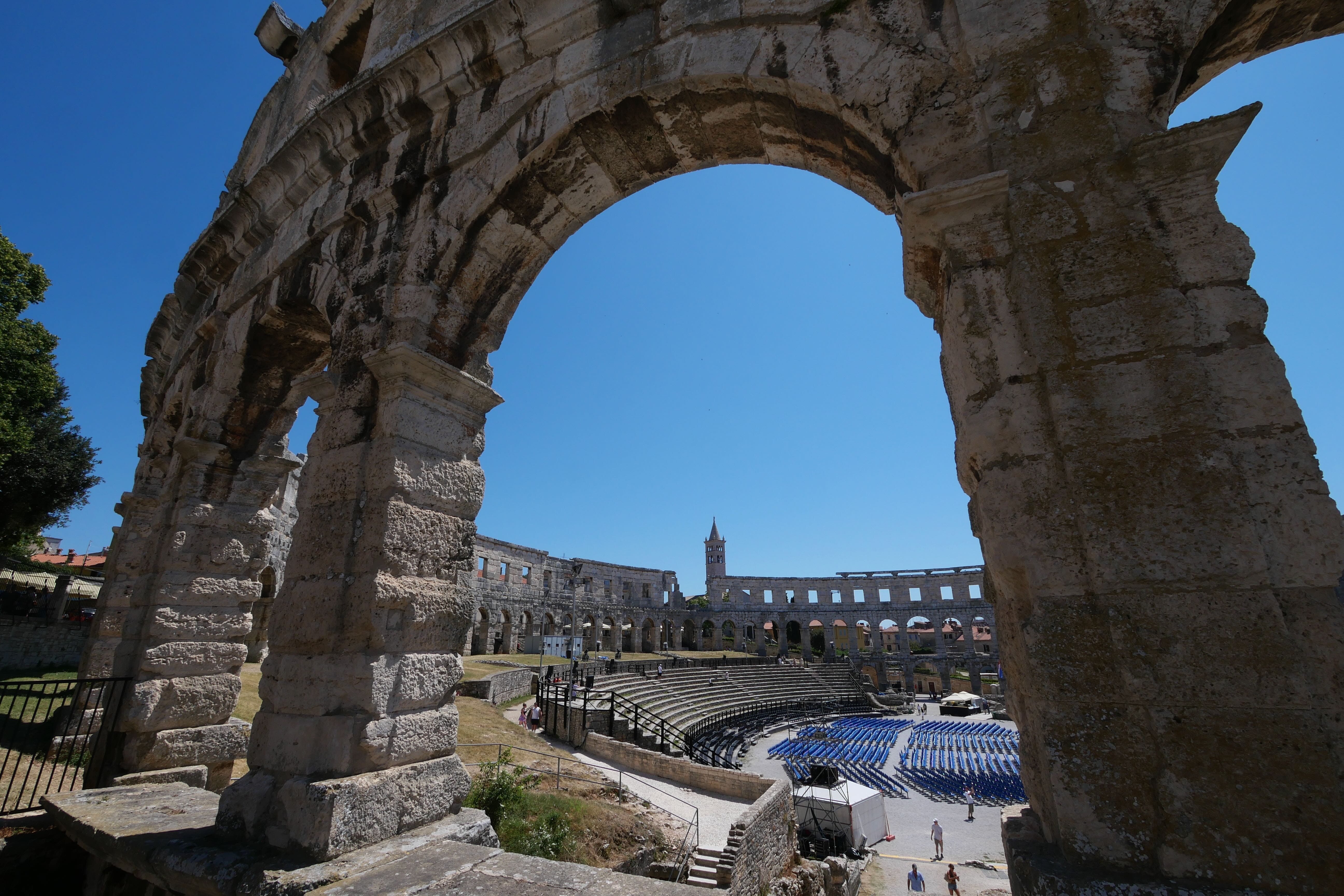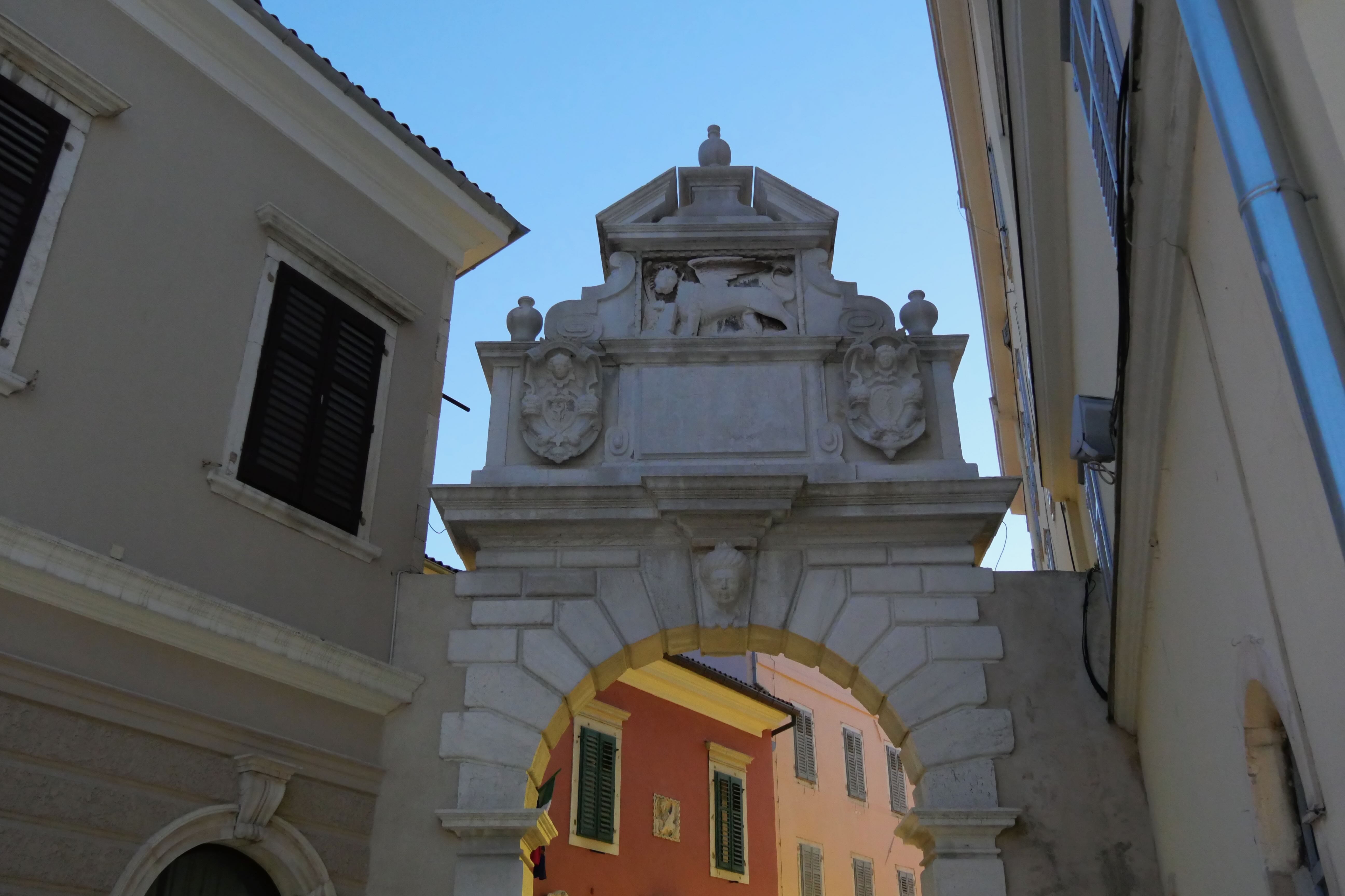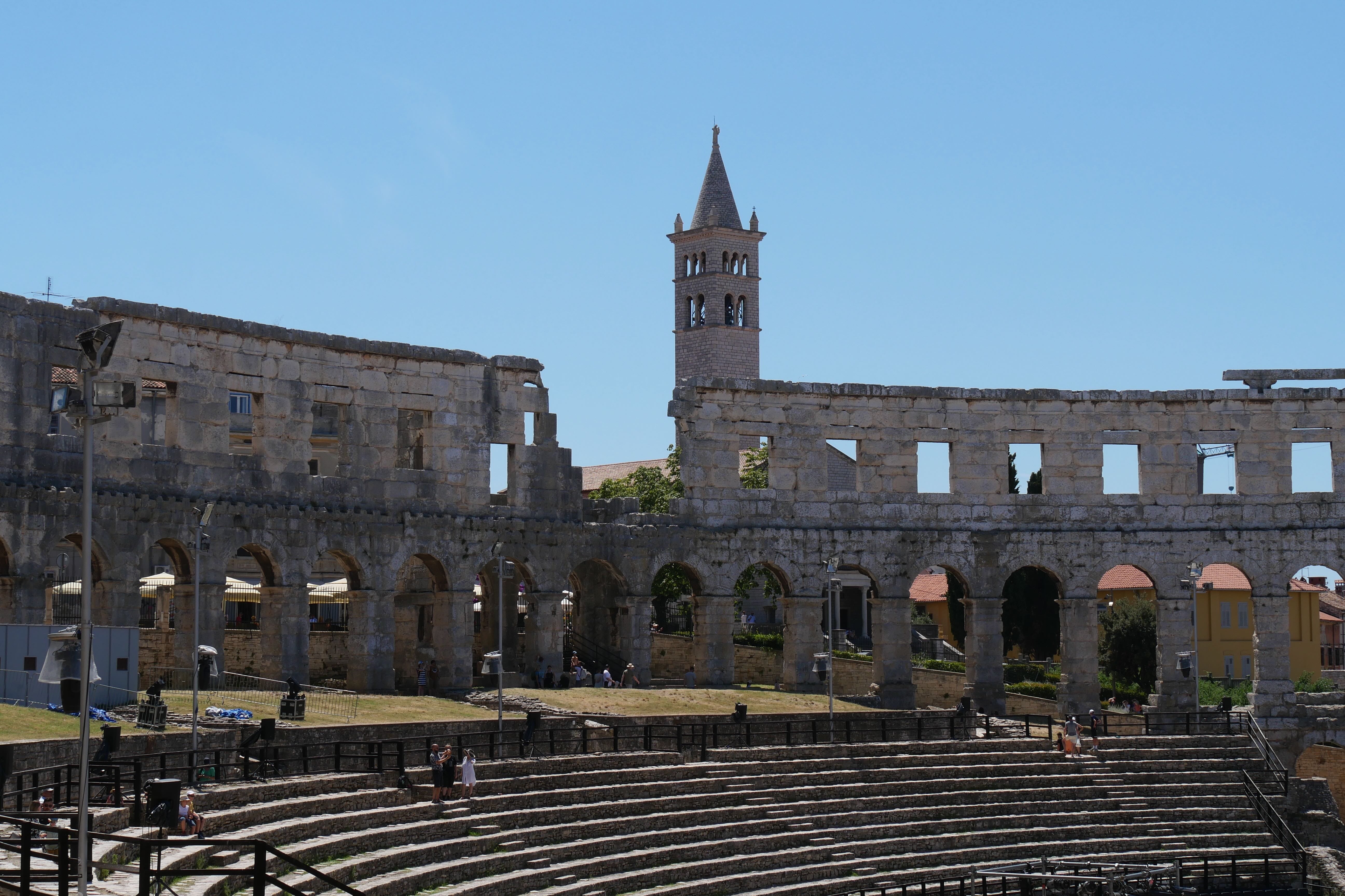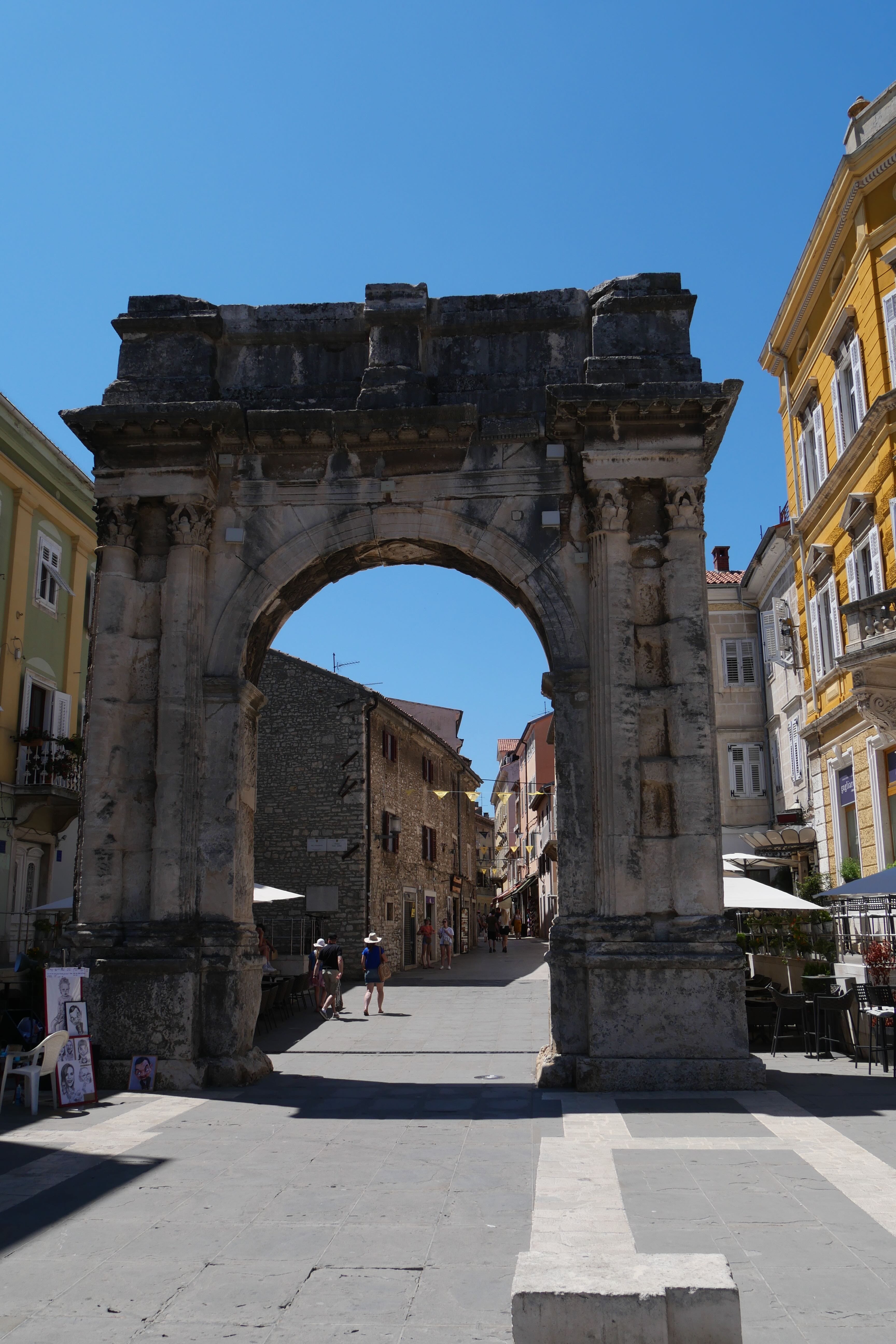 Deuxième partie de Pula, après les falaises, le centre historique. On trouvera une place sur un parking un peu particulier du nom de Emova mais on appréciera son petit prix de 2€ pour 4h (que l’on règlera grâce à l’app Bmove qui nous aura aidé plus d’une fois pendant le séjour). On n’y passera finalement pas autant de temps, la chaleur étant écrasante à ce moment de la journée. On ira droit aux essentiels. D’abord, l’amphithéâtre, à quelques minutes à peine du parking. C’est un vestige romain magnifiquement conservé. Sa situation dans la ville fait qu’il est possible de très bien voir l’intérieur à travers ses arches et cela en rend la visite, à 10€ par personne, pas forcément nécessaire. On préférera utiliser cet argent à bon escient dans les glaces de chez aROMA. On grimpe (oui ça monte un peu) ensuite vers la citadelle pour prendre un peu de hauteur sur la ville. On en évitera à nouveau la visite, encore une fois, la chaleur ne nous donne pas envie de nous éterniser. Après la descente, on se dirige vers la place du forum où se trouvent le temple d’Auguste, édifié au début du Ier siècle (probablement du vivant de ce dernier), et le bâtiment communal, qui lui a été construit à la toute fin du XIIIe siècle et dans lequel a été incorporé l’arrière d’un autre temple, celui de Diane, n’ayant pas survécu à l’assaut des années. Dernier point d’intérêt à passer (d’après les informations glanées ça et là), l’Arc des Sergii, un arc de triomphe commémorant trois frères et ayant été construit probablement vers 29-27 avant JC.