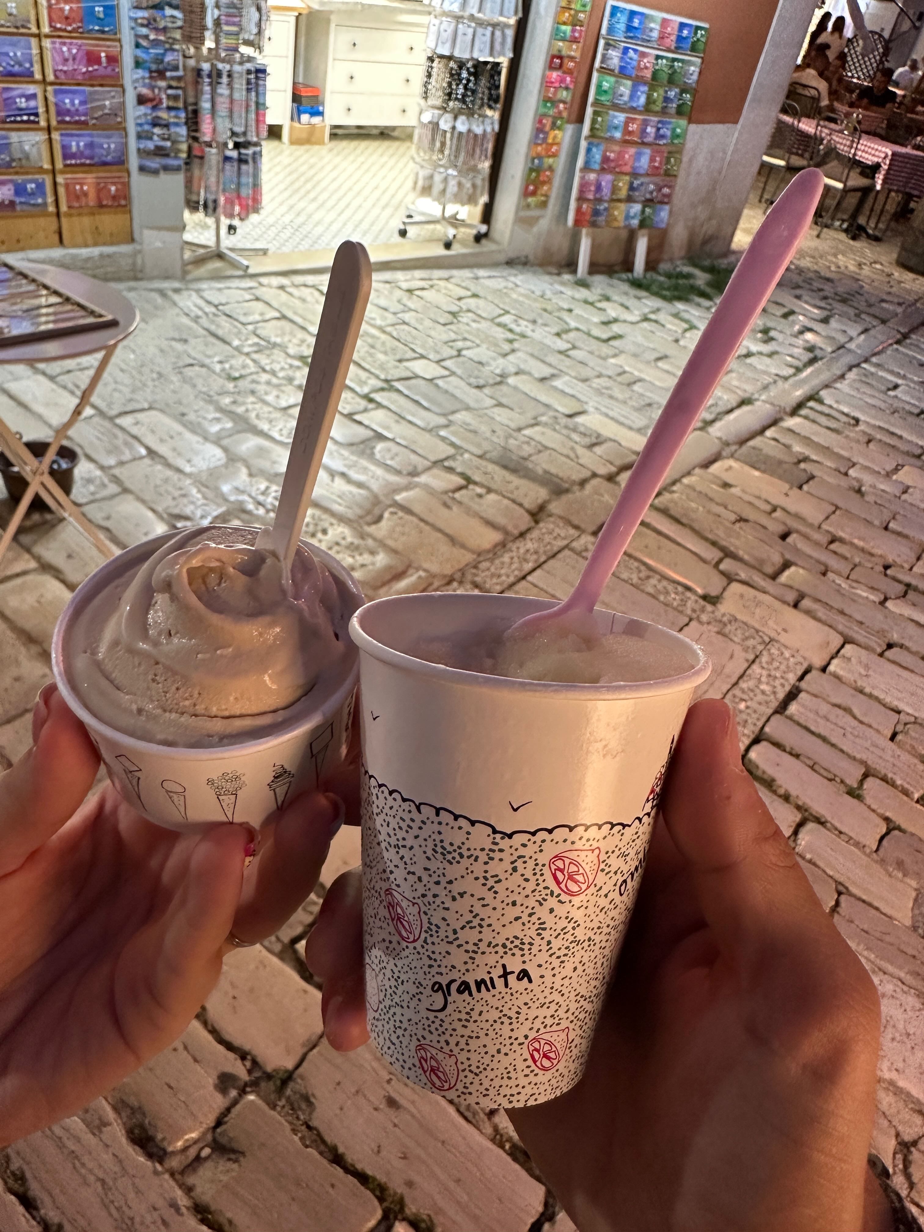 Nous arrivons à Rovinj peu après 19h, on prend possession des lieux avant de préparer notre dîner. La belle météo ainsi que la proximité du centre-ville et de la mer nous encouragent à aller faire un tour. On prendra une délicieuse glace chez Ombra dans une des nombreuses petites ruelles de Rovinj. Glaces artisanales, des vraies pour lesquelles il faut mettre un peu le prix mais vous ne le regretterez pas. La véritable incursion en Croatie commencera demain.