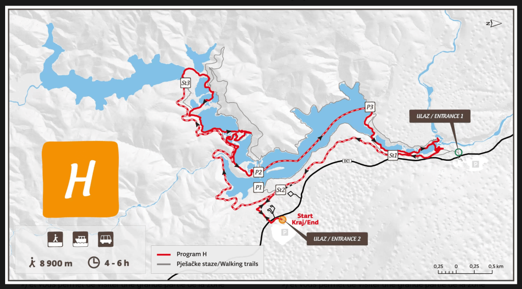 Départ vers 8h45 pour l’entrée 2 du parc national des lacs de Plitvice pour une entrée entre 9 et 10h avec nos billets à 40€ par personne. Mieux vaut les réserver à l’avance, le nombre de visiteurs pouvant être limité. Vous pouvez les trouver sur le site officiel, ici. Il faut compter au moins une bonne dizaine de minutes du parking jusqu’au point de départ de la navette ou du bateau en fonction du programme choisi. Pour nous ce sera le programme H qui nous semblait le plus complet pour une difficulté acceptable. Les différents programmes sont également consultables sur le site pour préparer au mieux votre journée.